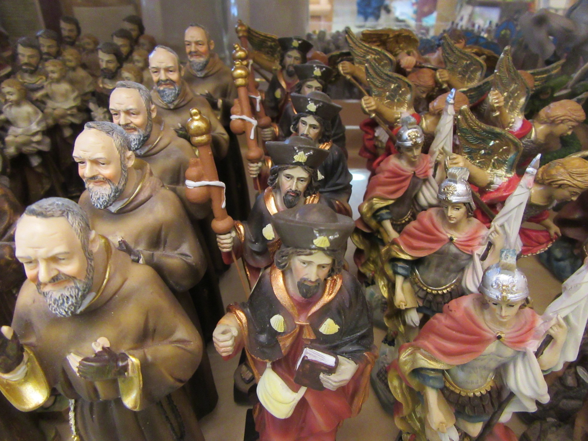 The monastery also had a gift shop, where I was happy to get a souvenir sticker. There was a nice selection of other monastic products, like bitters, and lots of statues and crucifixes. There were several large crowds of religious figures, like these: