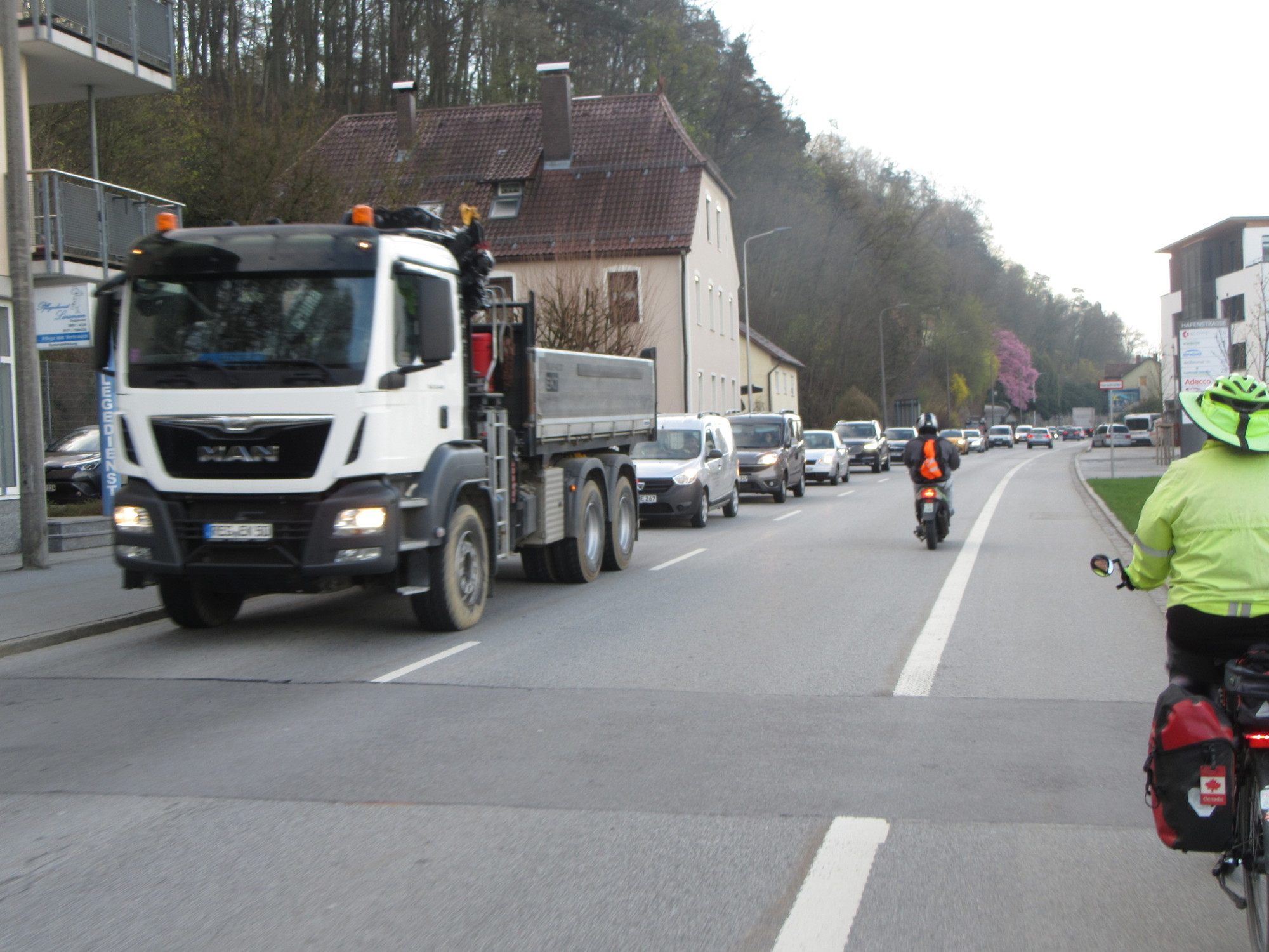 The way out of Deggendorf, like the way in, features traffic and not very lovely surroundings. I was kind of dozing through this when Dodie pointed out that there was actually a traffic jam. Much as I might grouse about traffic outside cities on this tour, cars are in no way as present or as problematic as back home. So any kind of traffic jam is newsworthy. Here is my traffic photo: