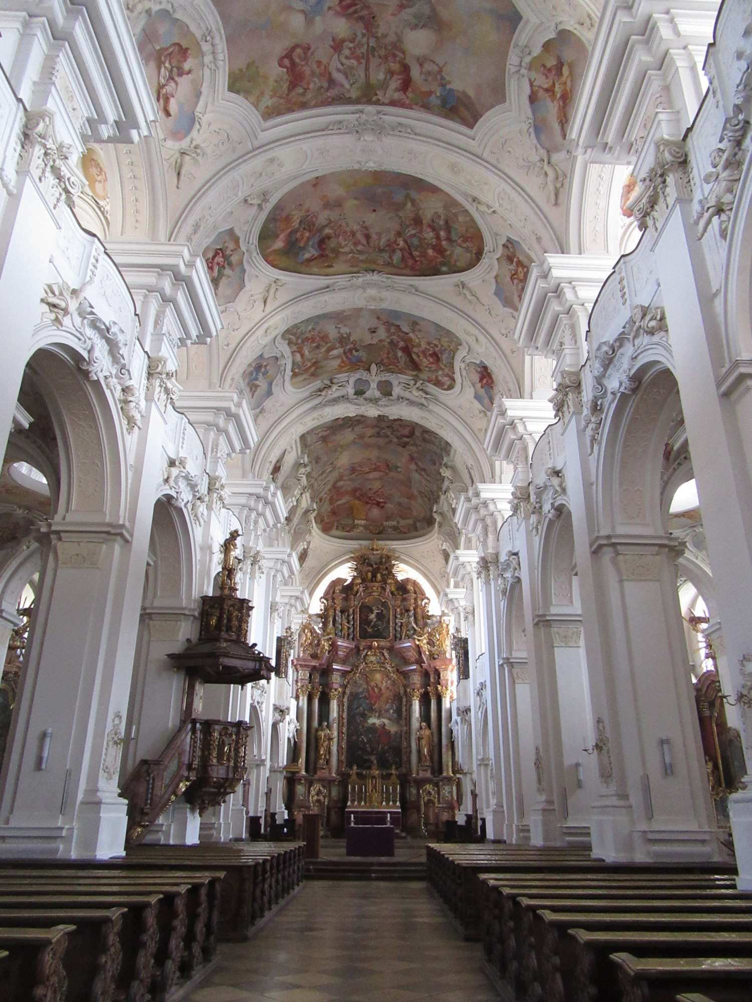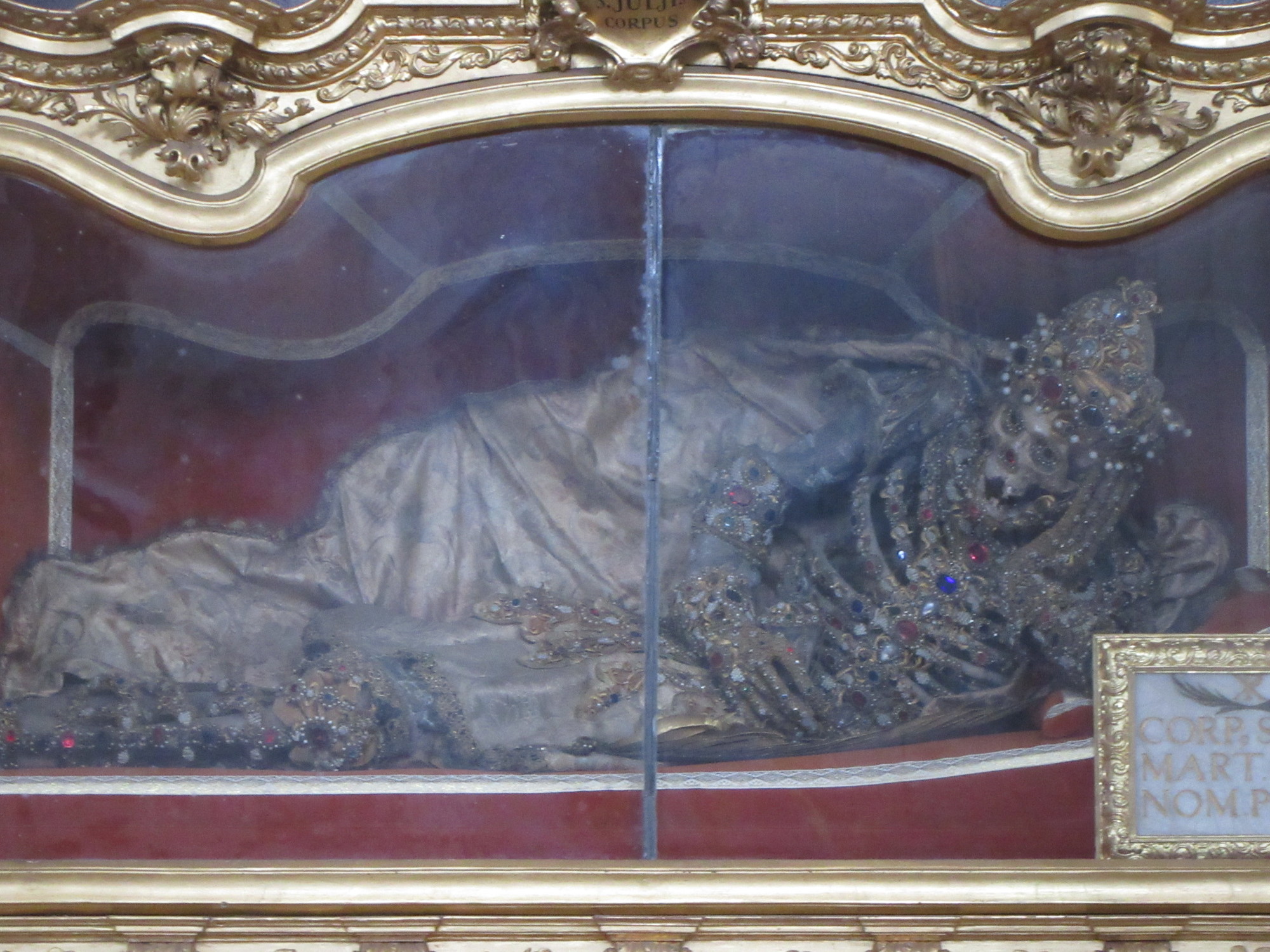 We did arrive in Niederalteich (which any which way is no more than 15km from Deggendorf, so why all the whining?). Niederalteich has a large Benedictine abbey. Like many, this has had many ups and downs, and today houses mainly a school and a conference centre. But the church part has been well restored, and is very beautiful, with more than 200 ceiling frescoes. A weird feature of the church is that it has at least a dozen installations along the sides of the nave, each containing a reliquary with bones. These are the bones of Christians who were buried in the Roman Catacombs, about 200 a.d. and brought here around the 17th century.