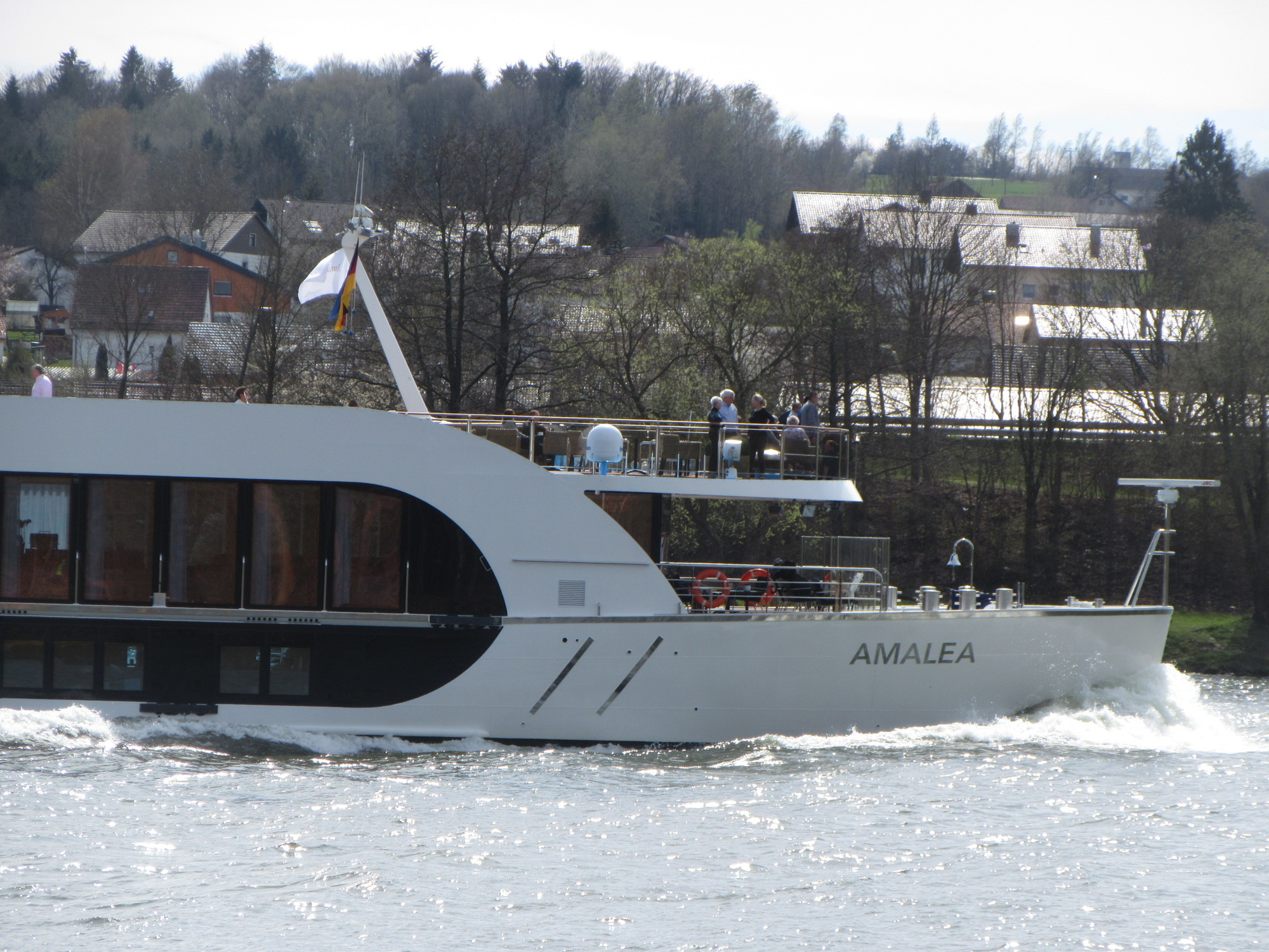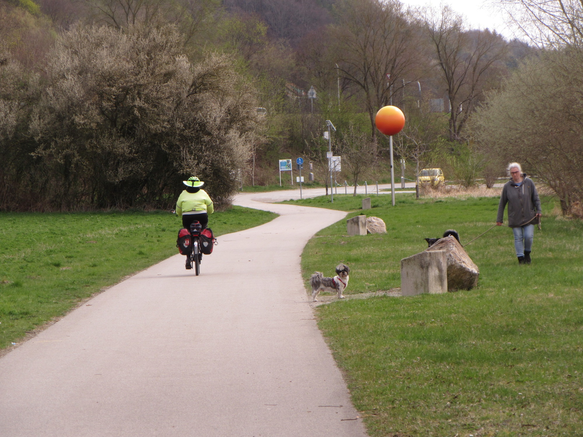 The rest of the ride into Passau really did not have much to enliven it. There was the good path, and the river, but not a lot more. OK, from Winzer to Vilshofen there is something called the Donauplanetenweg. This features little installations along the way, showing a planet in our solar system to scale (making the Sun a big beach ball and Earth a tiny ball bearing, with something like Uranus the size of a tennis ball.). The other part of the scaling is that the installations are spaced in relation to the distances between planets. Because of that, the inner planets are just meters apart, while it is 4 km out to Neptune.
