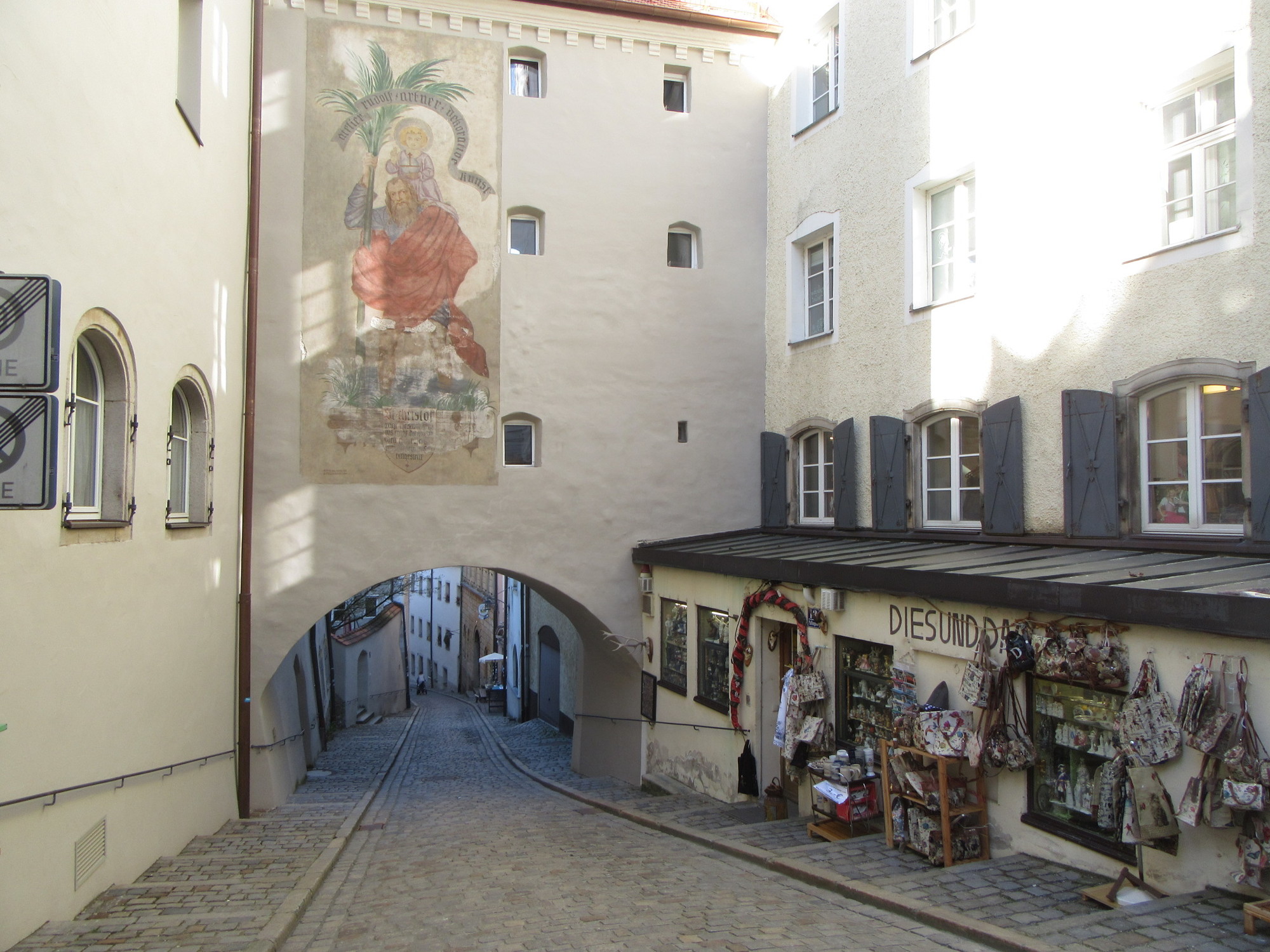 As I am sure our GPS track will show when zoomed in, we then diddled around and around the town. I never did get my bearings, such as by fixing on one street that I could always recognize. The town is quite medieval in layout, with alleys and tunnels, and so a bit hard to get a grip on. The architecture too was sort of hard to recognize. So here unfortunately are some quite random images. They are a good representation, though, of how things looked to me.