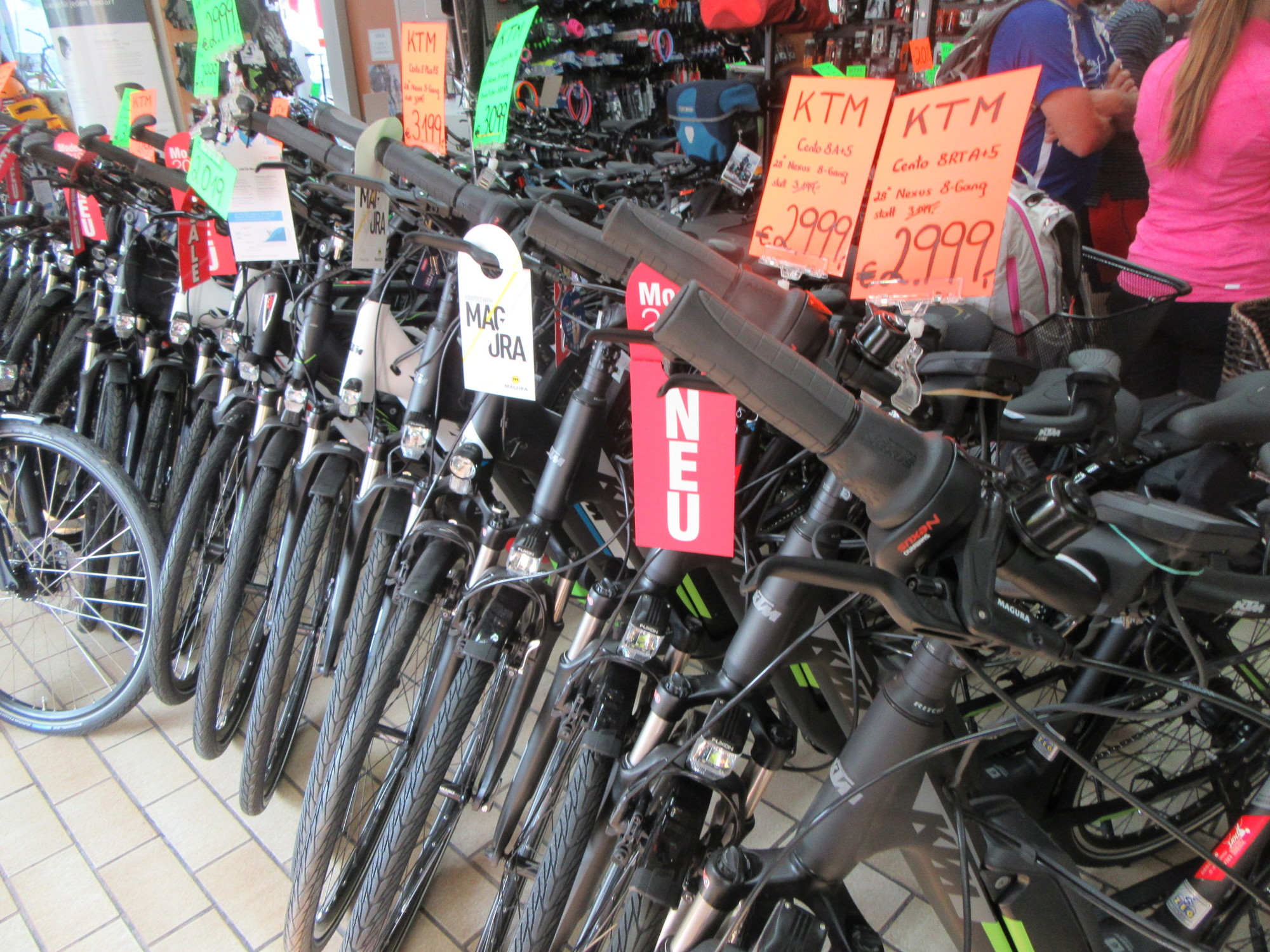 We had resolved to find a bike shop for a check of our chains, but I did not expect to fall across one any time soon. Wrong. We tripped over one almost immediately. It was quite large, but we got the attention of a staffer right away, and he whipped out a chain checker quickly. He declared our chains to be ok, so we could relax. I was impressed by the careful way he then cleaned his chain checker, feeling a little embarrassed that we had involved his clean equipment with our vagabond bikes.