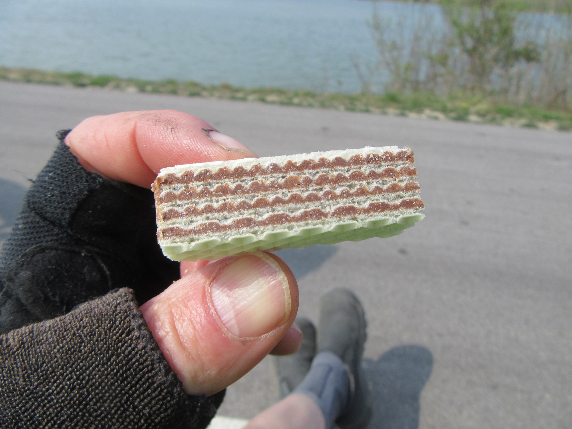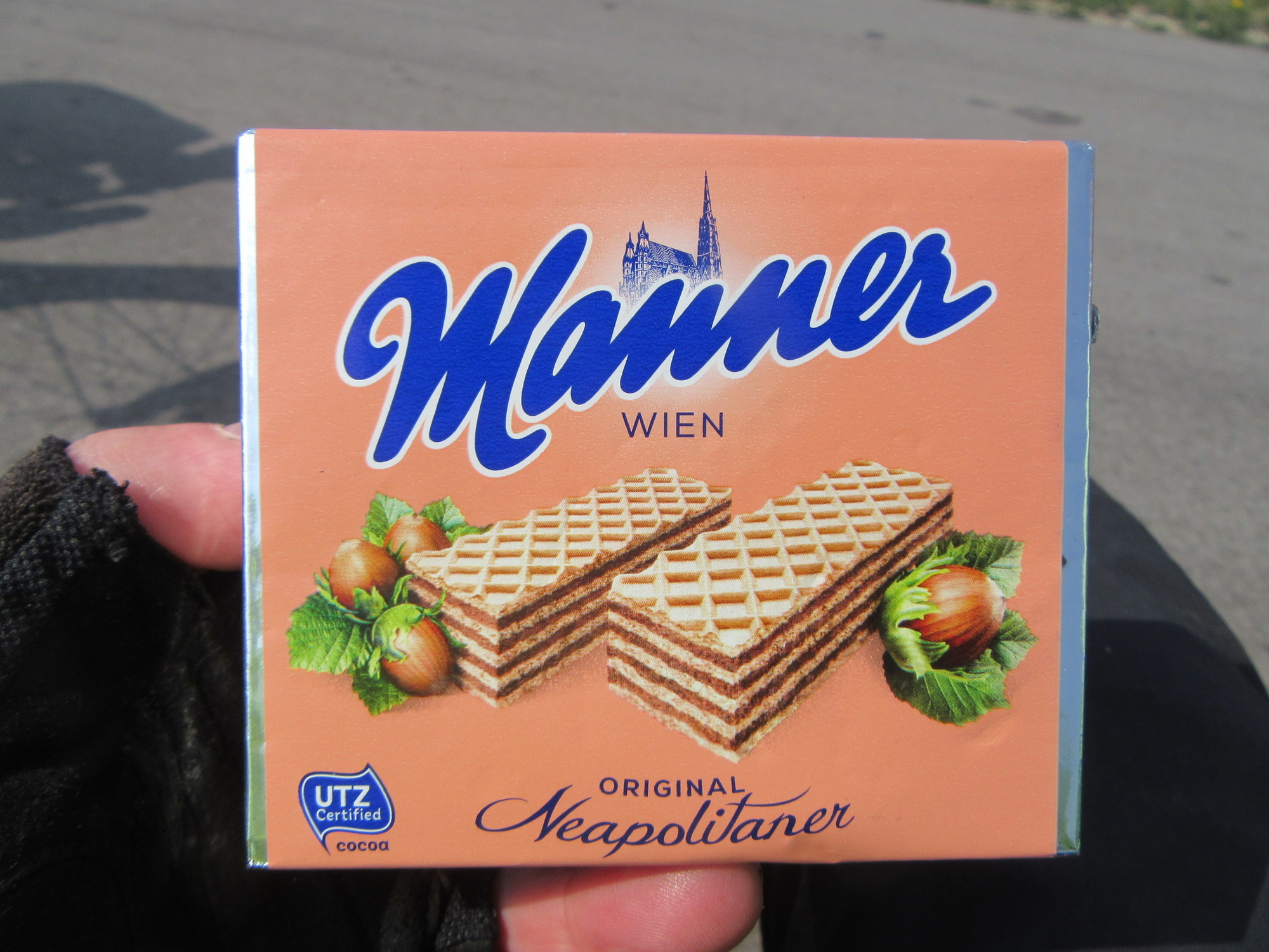 In Tulln Dodie found her stamps, and also something we had rather forgotten. It's the "Manner" wafer biscuits, made in Vienna. These are a rival for anti-bonk purposes to German "Knoppers". See how they have layers? Does that make them tortes?
