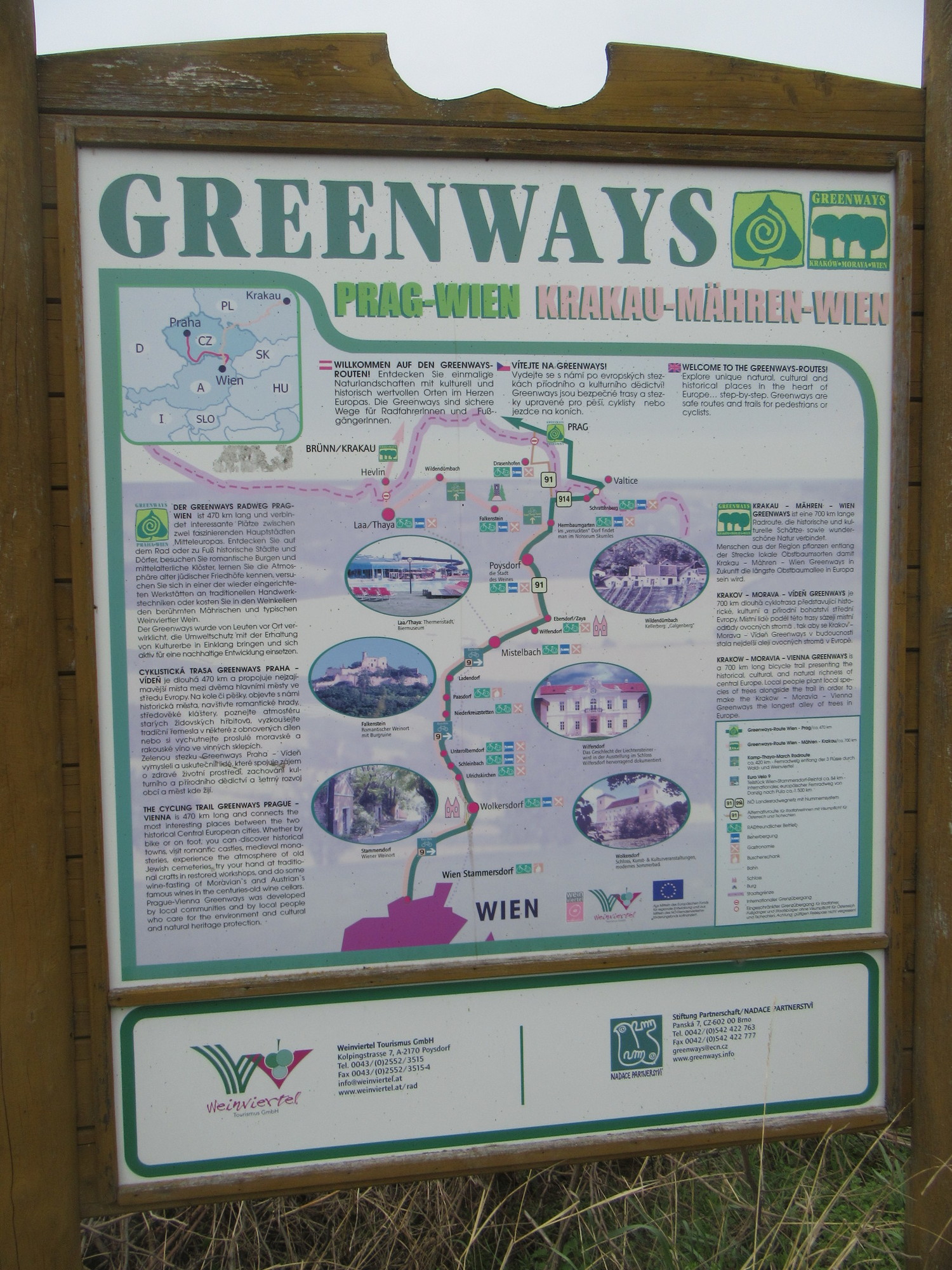 We are now poised at the edge of the Czech border, and have even run into our first Vienna to Prague Greenway sign. This is a sign that another cyclist also photographed (or one just like it), and that at home we greatly enlarged to learn as much from it as we could. And now - here we were standing directly in front of it.