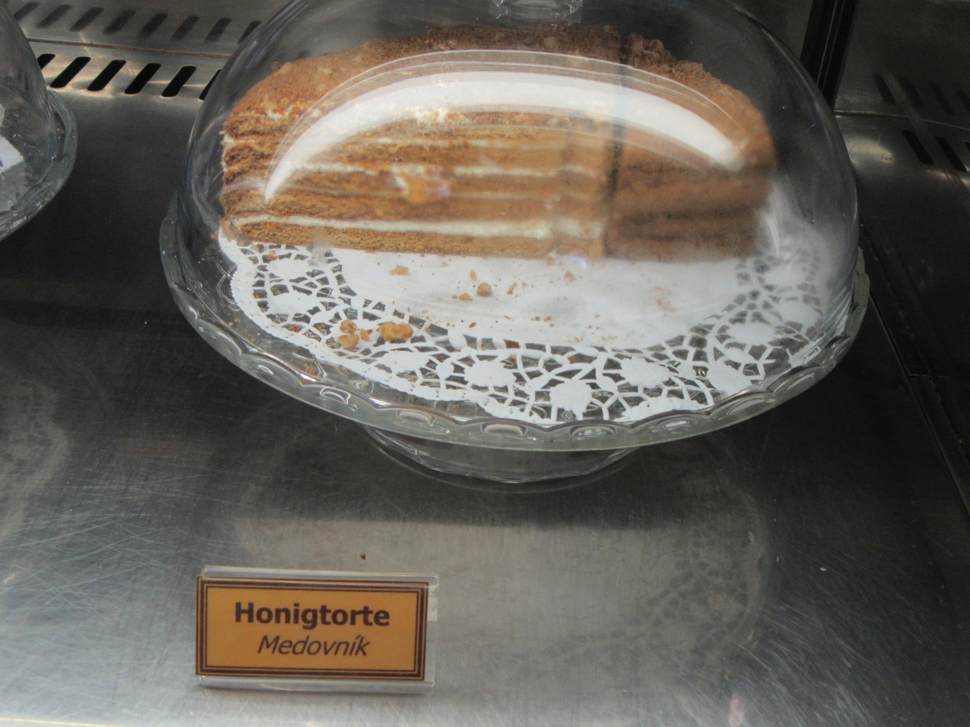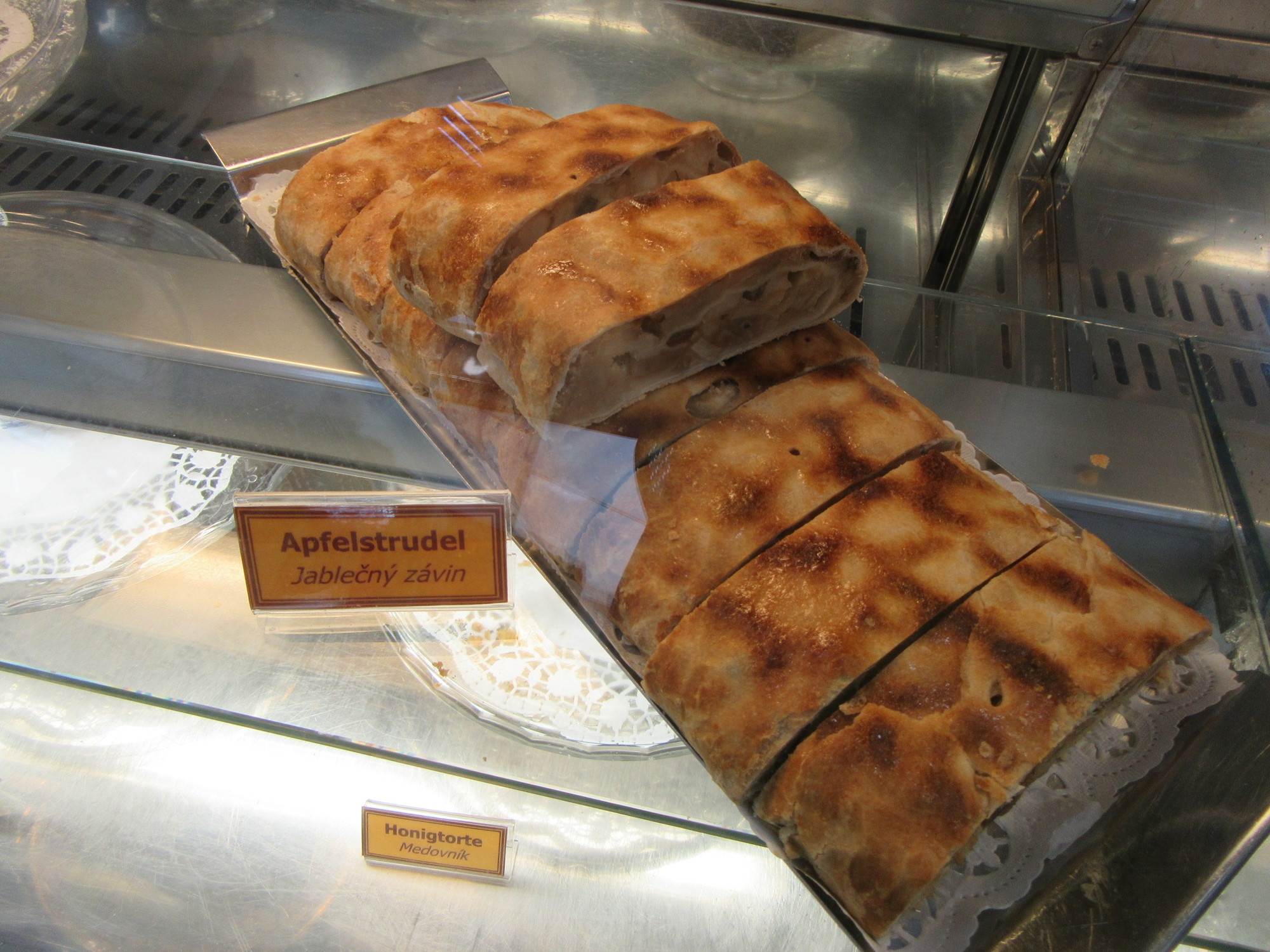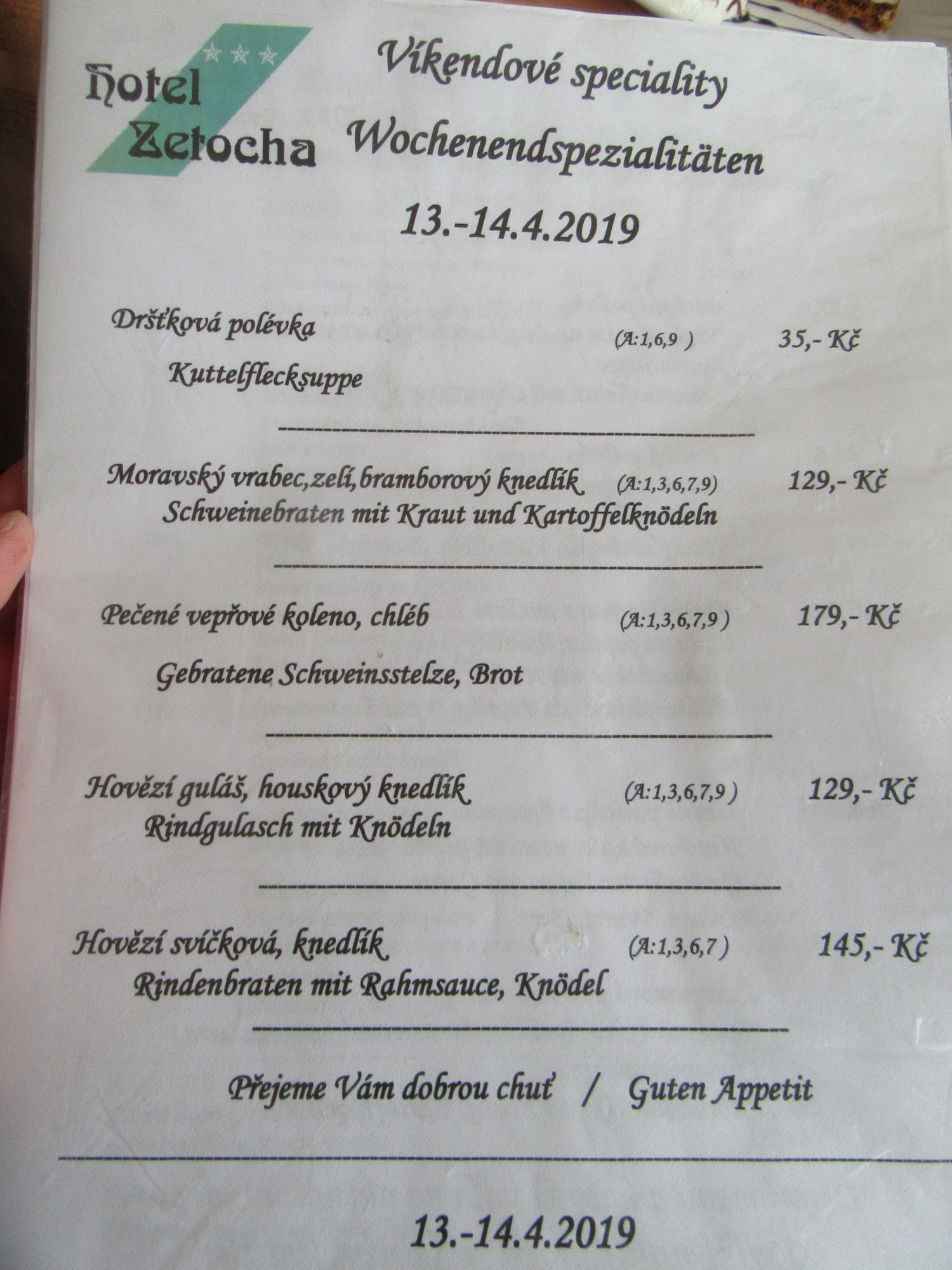 Place #2 was a hotel, with bar on one side and restaurant on the other. In the restaurant there were two other customers, making it feel not so lonely. On the table was a sign offering a torte! Ok, that was clearly our choice. But there was also the daily specials. The specials were written in Czech, with German translations. How strange that we should consider the German as our lifeline to making a choice. We wanted to make some choices, because though it was early and though we had lots of stuff from the Billa, the prices were too low to ignore.
