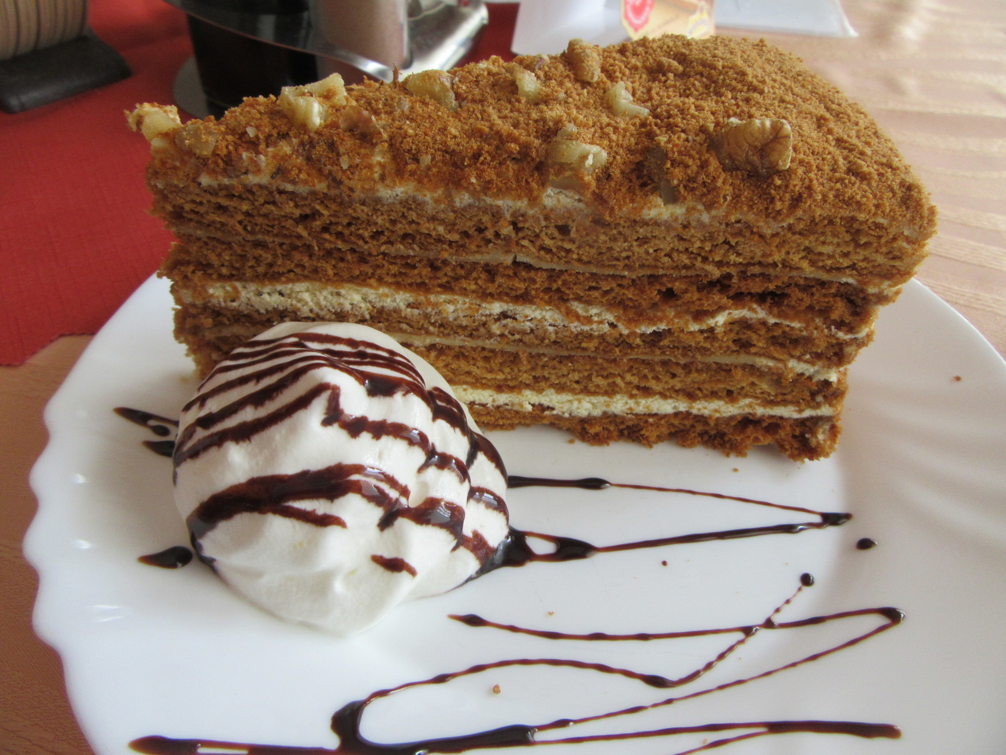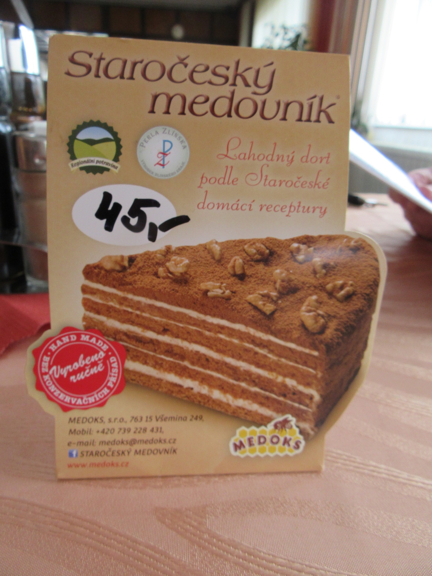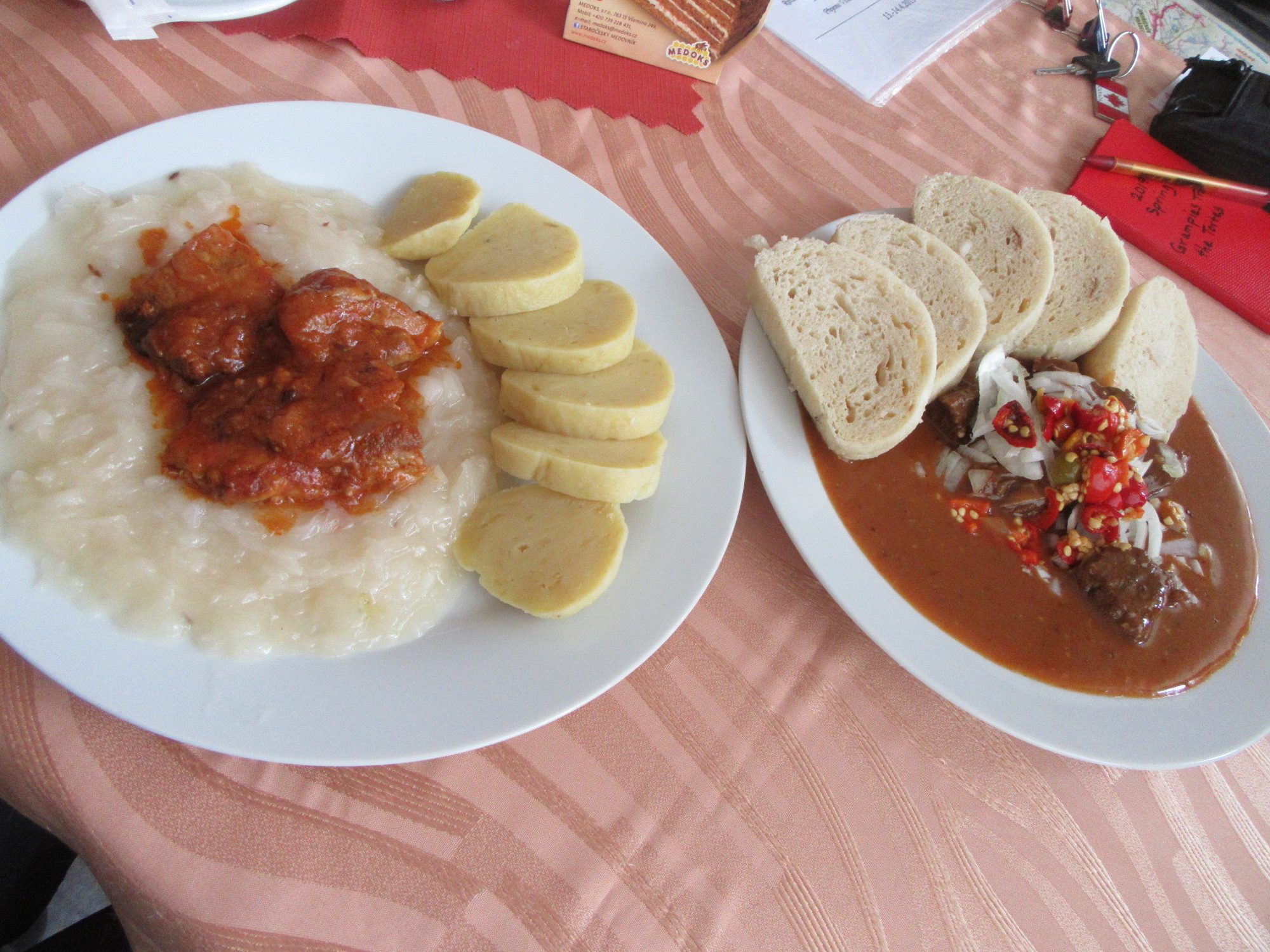 Place #2 was a hotel, with bar on one side and restaurant on the other. In the restaurant there were two other customers, making it feel not so lonely. On the table was a sign offering a torte! Ok, that was clearly our choice. But there was also the daily specials. The specials were written in Czech, with German translations. How strange that we should consider the German as our lifeline to making a choice. We wanted to make some choices, because though it was early and though we had lots of stuff from the Billa, the prices were too low to ignore.