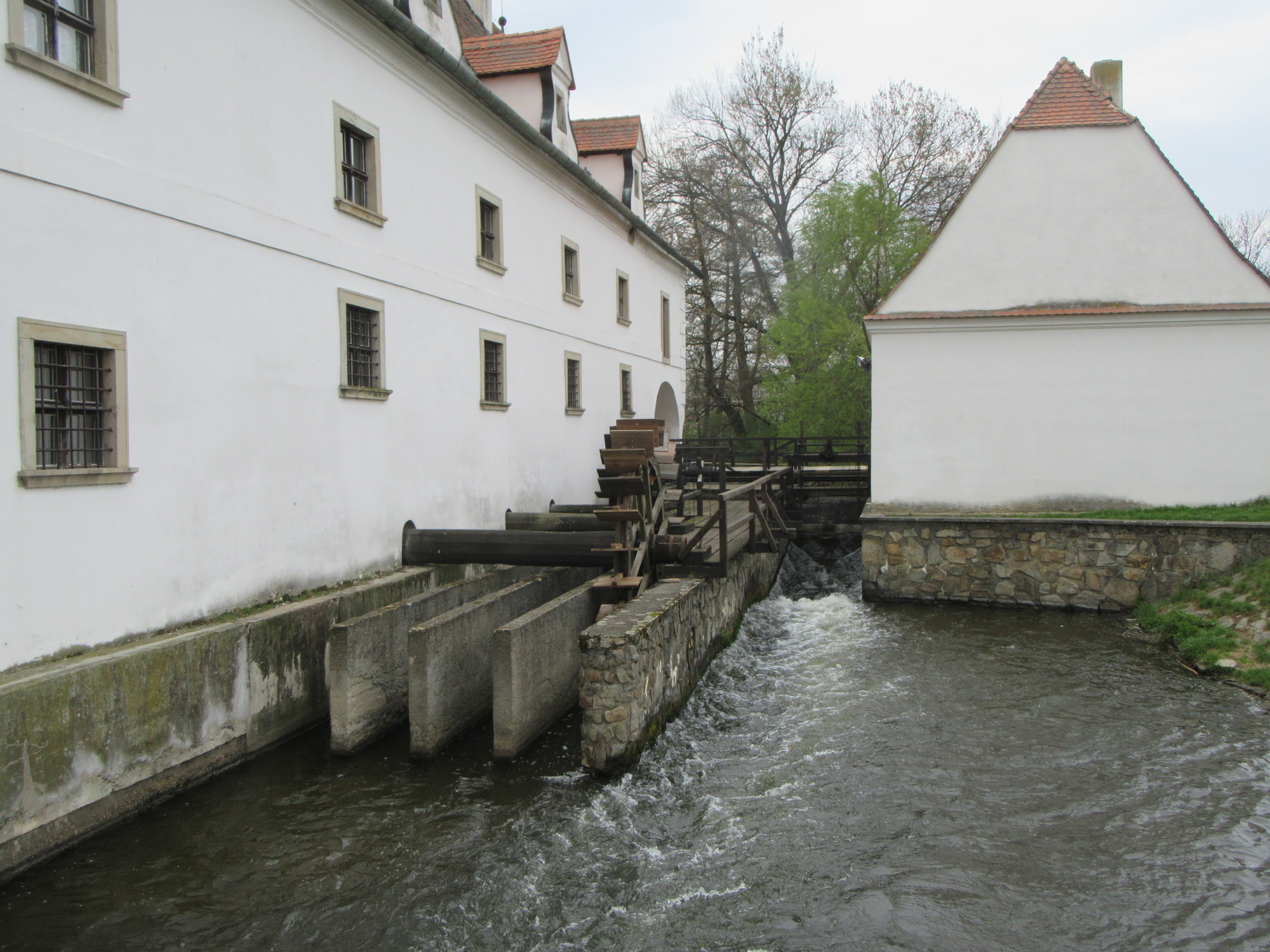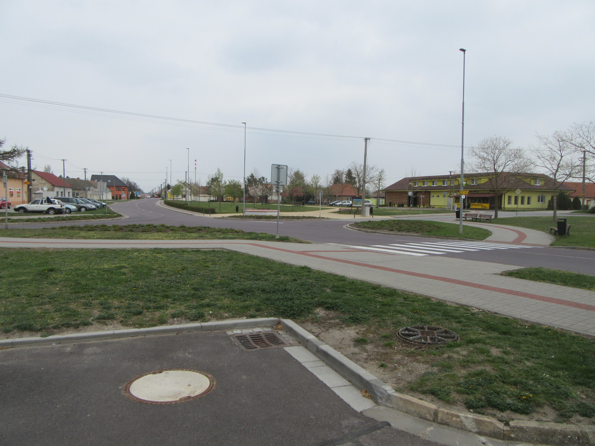 Quite quickly, well before noon, we rolled into Hevlin. In fact we were in the centre, but might not have recognized it except for the Tourist Information office there. It was open, and we had a nice chat with the woman inside. She spoke a little English, a little German, and a little (less) French, but we cheerfully tried them all out. With the smooth Greenway we were confident that we would reach our short destination for the day of Chvalovice quite handily, so we were looking for a cafe to while away some time in. Our TI lady pointed out not one but two such places in town. She did this not by the usual method of pulling out a map, circling where we are now and putting an X on the cafe locations. Rather she stepped out the front door and pointed to one, slightly left, and the other slightly right. Hevlin is not a very big place!
