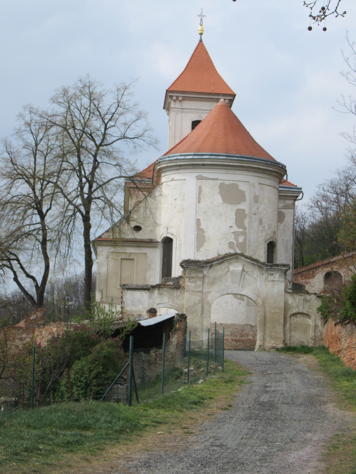 At Jaroslavice there is a large monastery. Before reaching it, we came to a series of fish ponds. Dodie reasoned that the monks might have grown fish to support Friday fish meals, while that was still the custom. As we were talking about the fish, we came across a dead one on the trail. It was a carp type, but I declined to make a photo of it. We sometimes will put road kill in the blog, but not often. How did the fish become road kill - crossing without looking? This was answered a few yards further on, where a live one was flopping on the road. This produced the theory that the fish had been retrieved from the ponds and dropped by birds. "I can make a photo of this live one!", said I. "No, don't waste time, throw it back in the pond", was Dodie's response. So I lobbed the fish toward a pond. It bounced off a rock before going in. "You killed it!" I prefer to believe that slightly stunned, it nevertheless swam off.