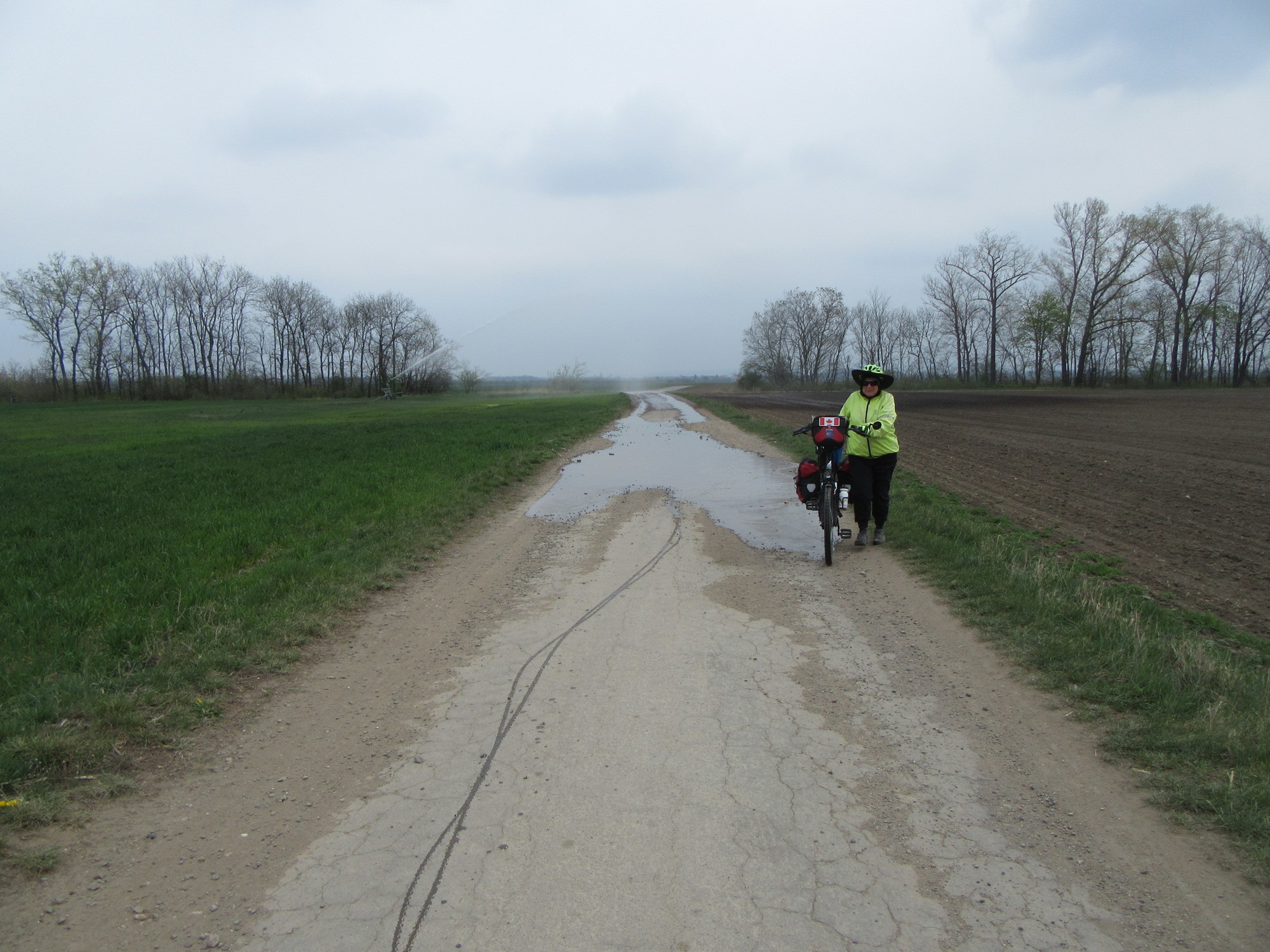 At one point, irrigation had flooded the road, and I went forward to "test the waters". It turned out that a large puddle concealed a large hole with a very rough bottom, so I had to balance well and push boldly forward to avoid a spill. Seeing this, Dodie was able to come through a shallower bit.