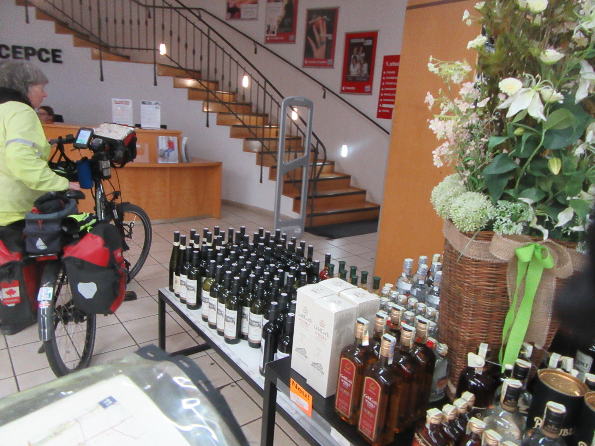After paying our 42 euros and getting the key, I was directed into an elevator to go to the room. The elevator had only one choice - floor 1 - so finding room 15 should be easy for such a veteran traveller. I got off, and turned left, finding room 1 and 2. Ok, I turned right, and found a Fußpflege (foot care) salon and a frisur (hairdresser) and who knows what else, but no room 15. I showed my key to the foot care lady, but she had no idea what I was going on about. I retreated down the elevator with my bags and exited to have to explain to Dodie that I could not find a room 15. The girl from reception had to come with me. Yes, yes, just one choice in the elevator. No, only rooms 1 and 2 are that way. We retraced my steps. Past the frisur, the girl said "there", indicating a blank white door. I pushed on it, nothing. "Use your key". Ahh. Through the blank door was room 15. One more turn of the key and I was home!