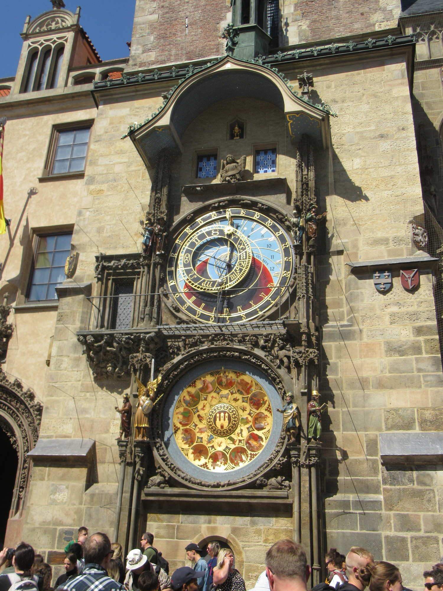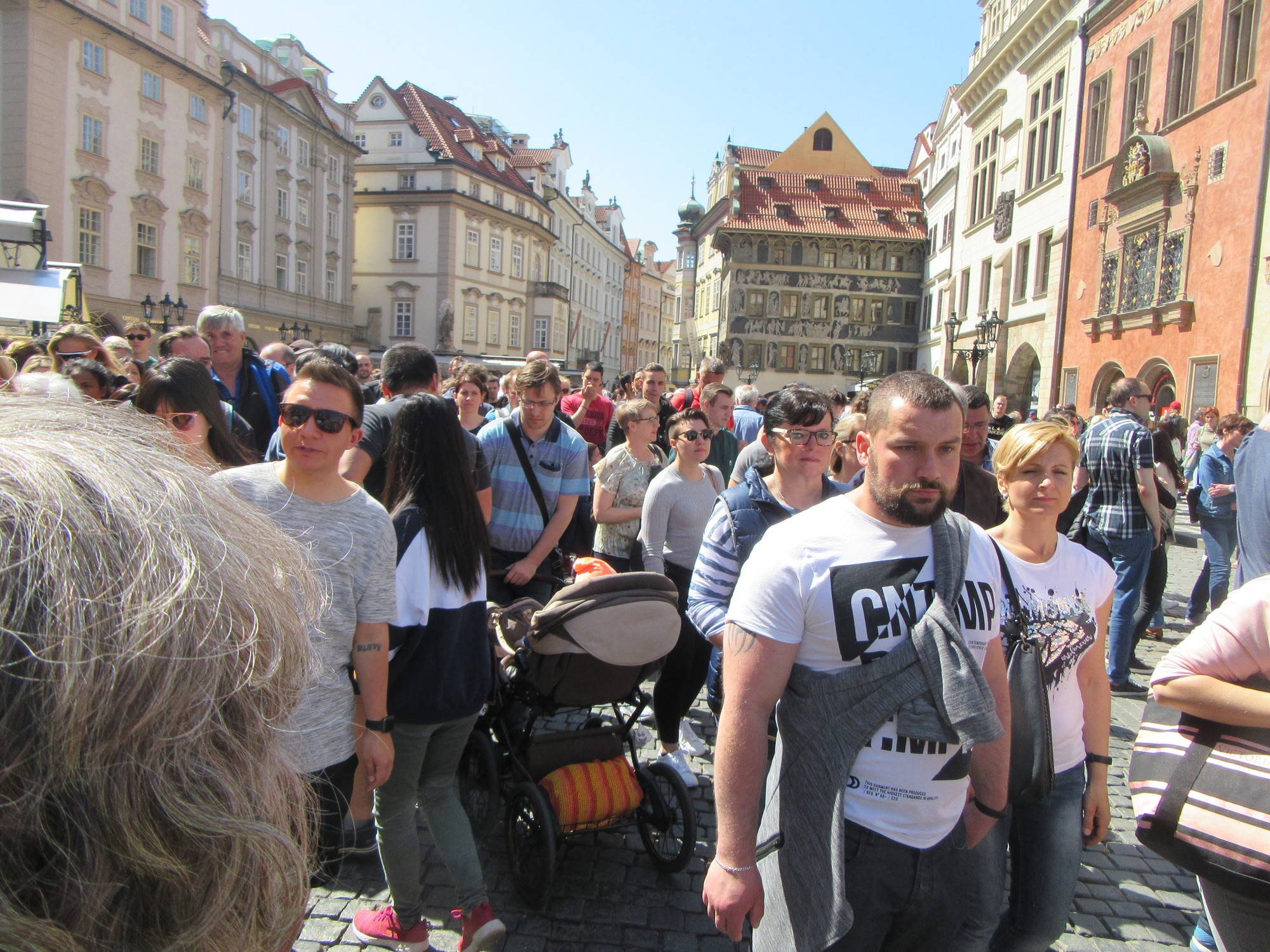 In this section of Prague, and of the Old Town Square, the greatest concentration of people is in front of the clock, when it is about to perform its thing. This includes a skeleton pulling a cord, a rooster crow, and then a parade of Apostles, followed by the chiming. To pass in front of the clock, either to get through to the road to the Charles Bridge, or to sneak a peek at the performance yourself, you need to part the crowds. I am rotten at this - too meek and polite - but Dodie, while polite, is more definite. So she took my hand in tow, and off we sent through the crowd. It was wonderful. I just floated though with no buffeting and to side stepping, right behind Dodie! It looked like this: