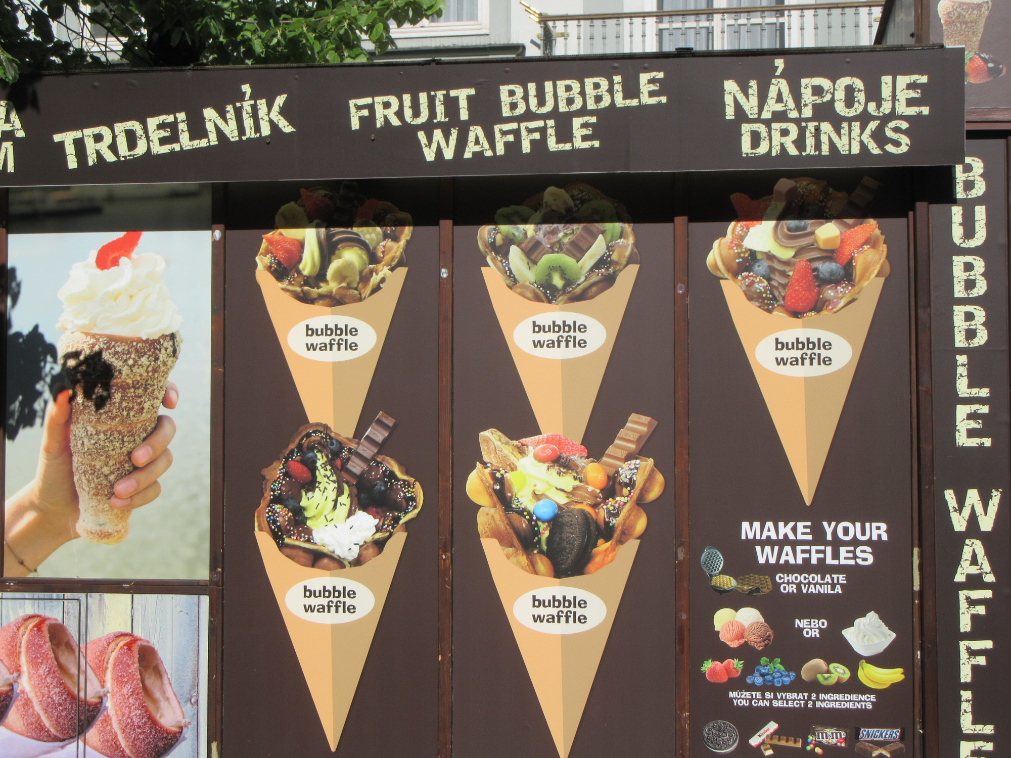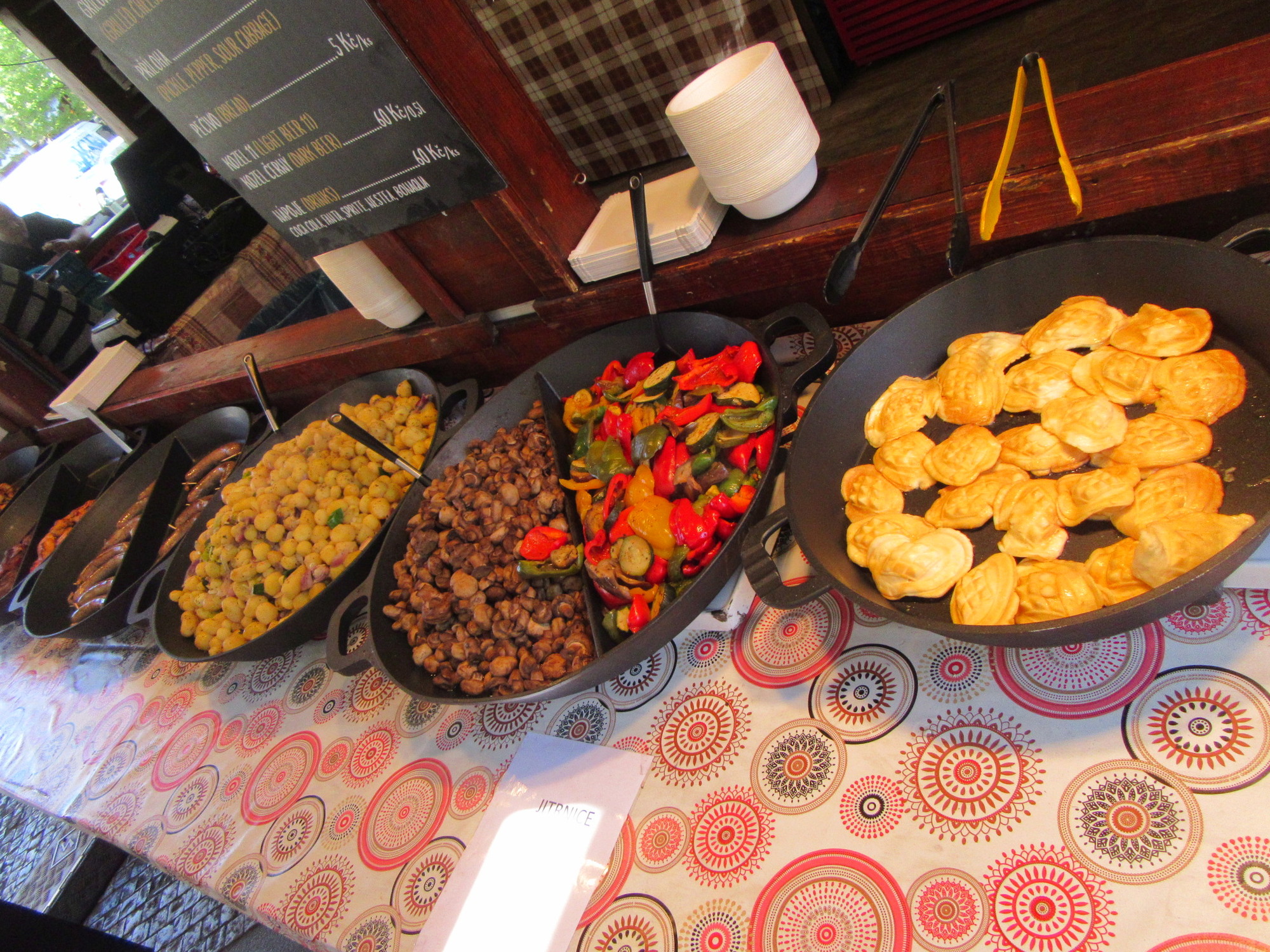 We had really been looking forward to some of the great street food on offer in Wenceslas Square, when we knew we would be swinging back around, toward evening. But when we got there, we were still full from all the things we had found downtown. Even so, we "forced ourselves" to get some of that great shish kebab, and a potato and cheese dish from one of the woks, and arranged it as well as possible as a take out. By the time we were back in the hotel, we were glad to be able to pull it out.