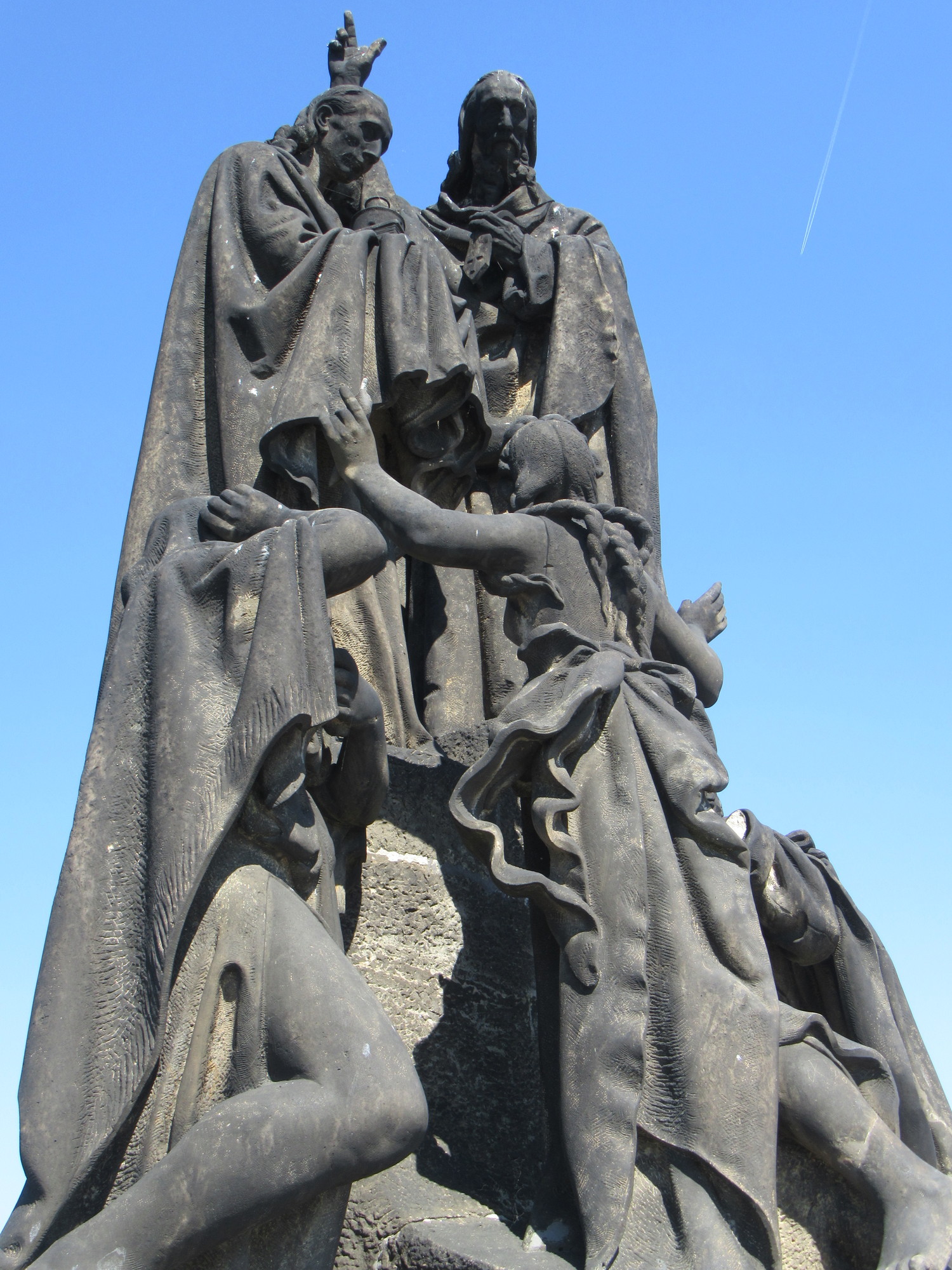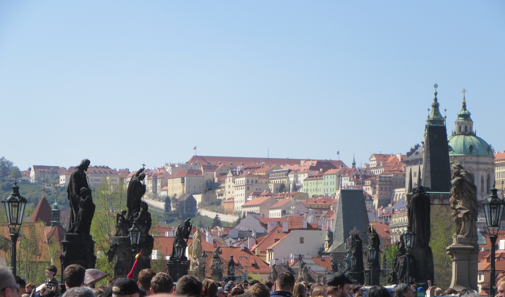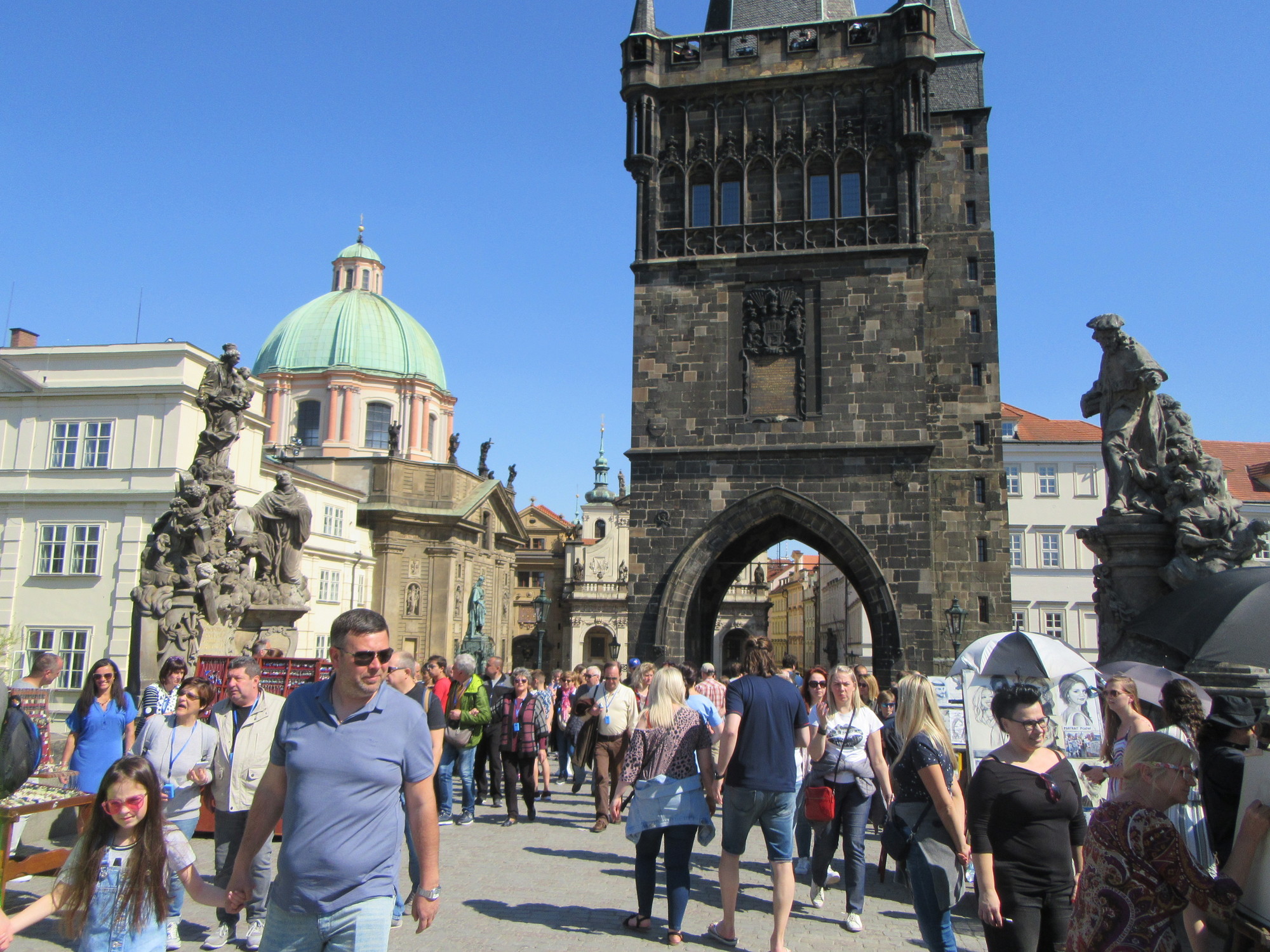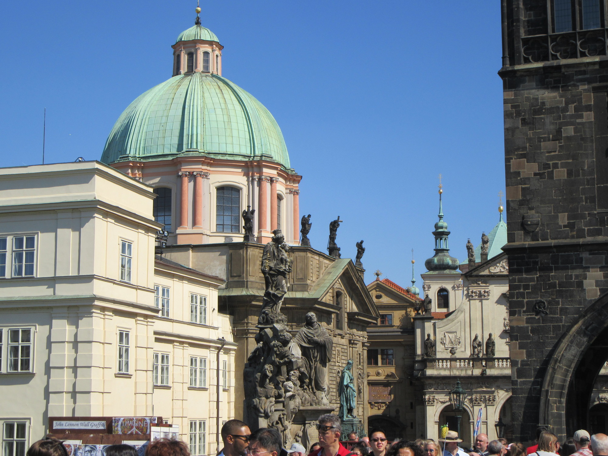 Next stop, the Charles Bridge. Named after Charles IV, he is the one portrayed in the statue I spotted yesterday. It's a bit of a struggle to go on the bridge, because of the crowds. Or actually the struggle is to get a photo, any photo. The bridge is lined with statues, but it is not possible to shoot them, due to so many people. If you really wanted to do this, you would have to appear at first light, while the tourists are all still at their provided breakfasts. (Dodie has noted that I did not describe our own breakfast, the one that helped to have us here so late. It was in fact worth it - with all sorts of cakes, vegetables including shredded beets, Prague frankfurters, hash browns... ok, snapping back to the bridge!).