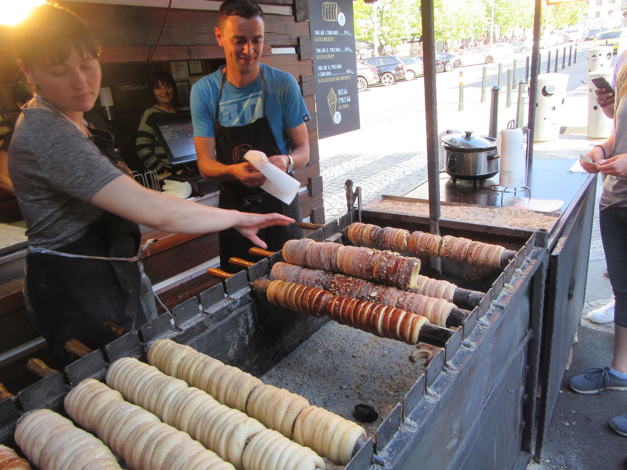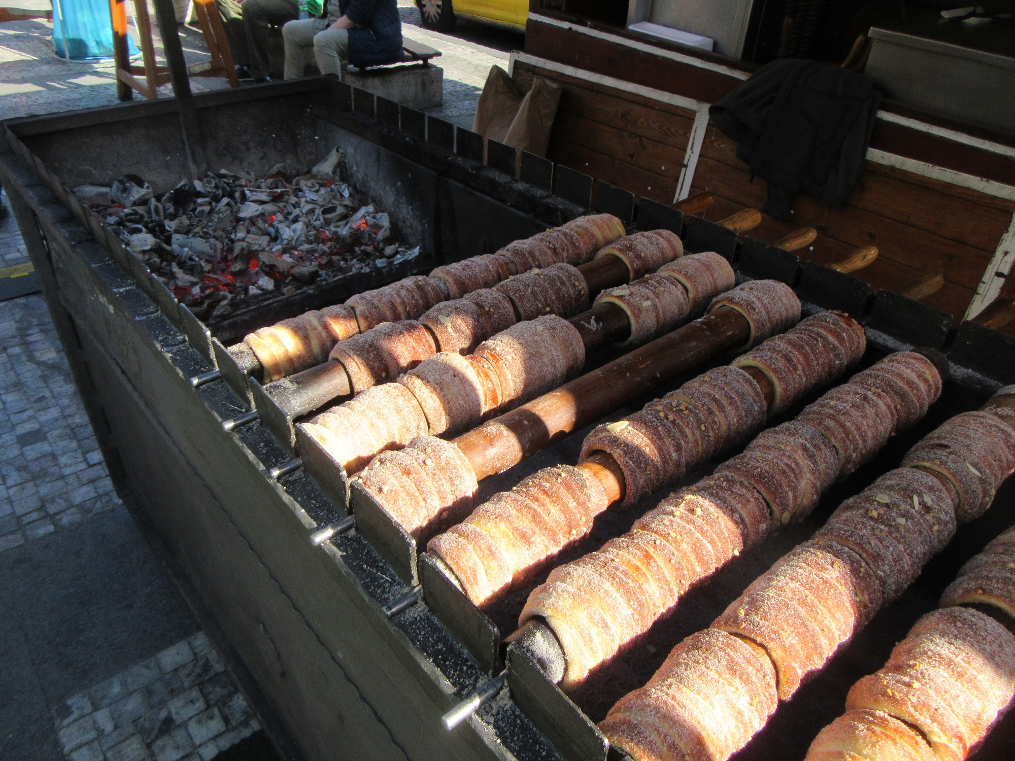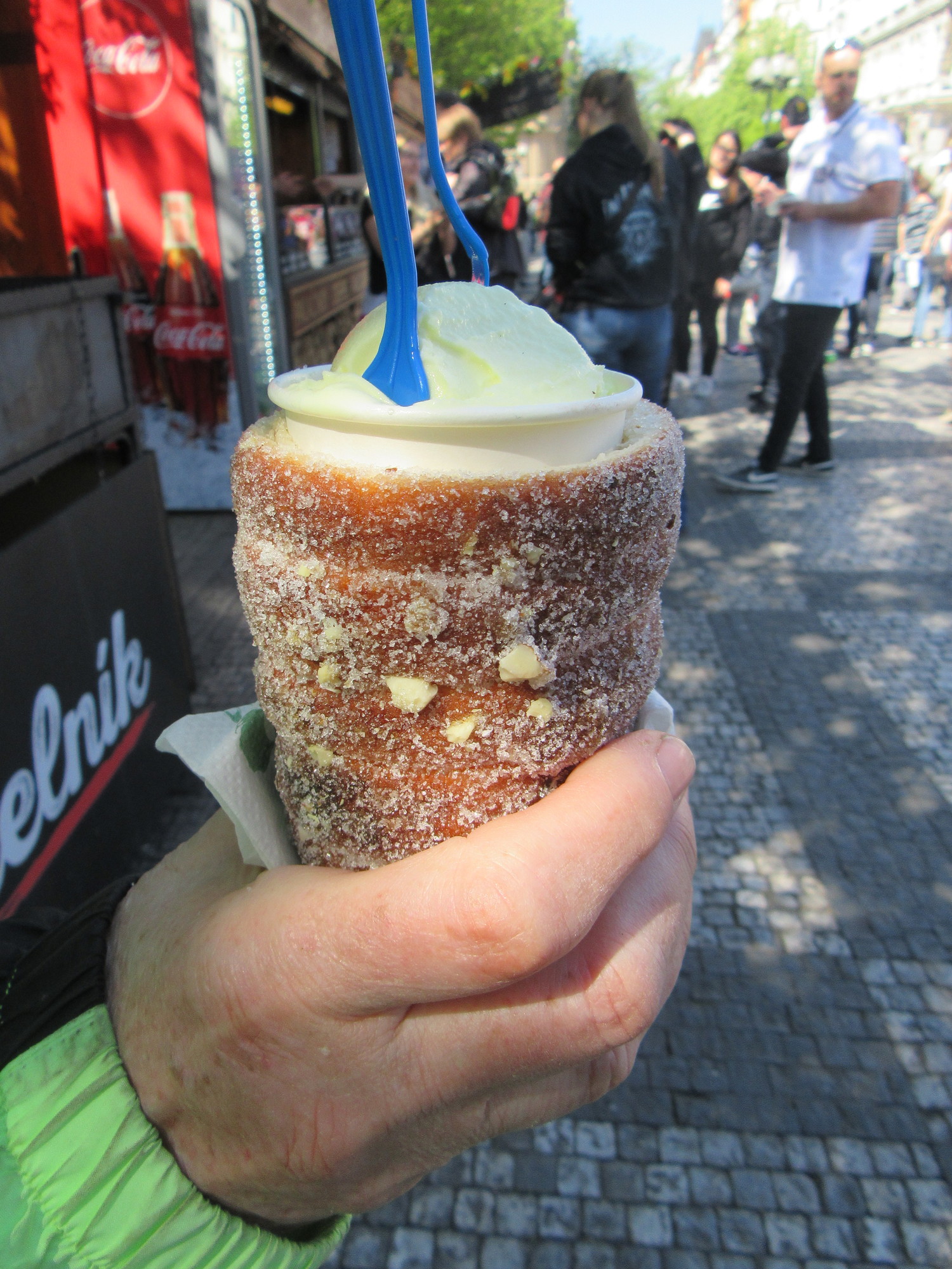 In other forms of the Trdelnik, the cyclinder seems to be filled and piled high with ice cream - like 4 inches above the top! But maybe this is not quality ice cream? Don't know, because we were just too full with other stuff to try another version.