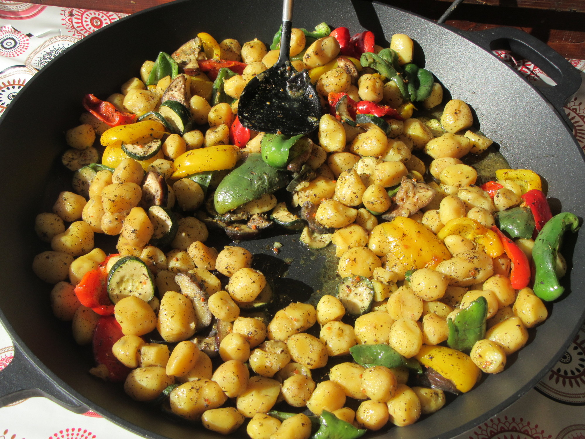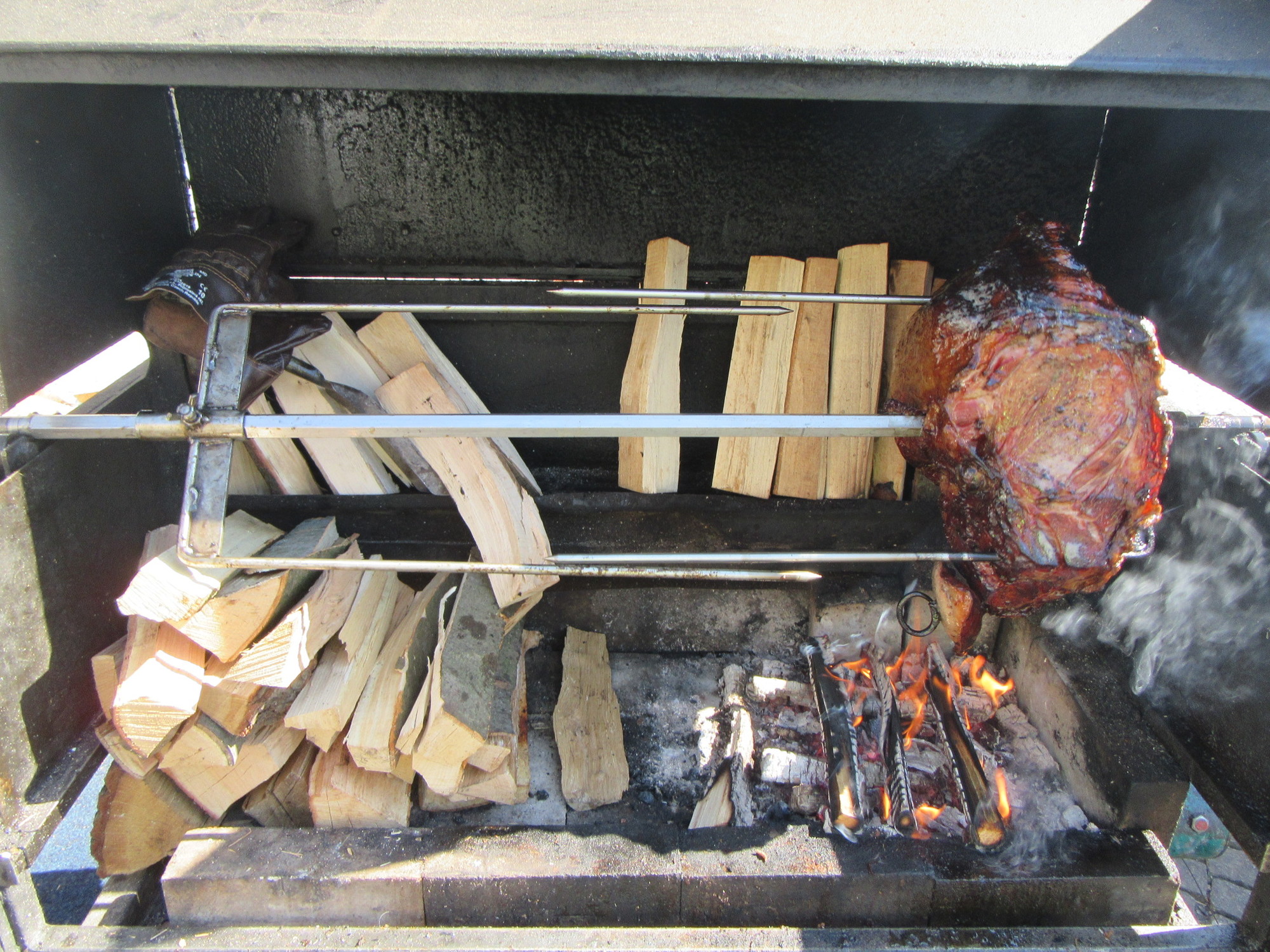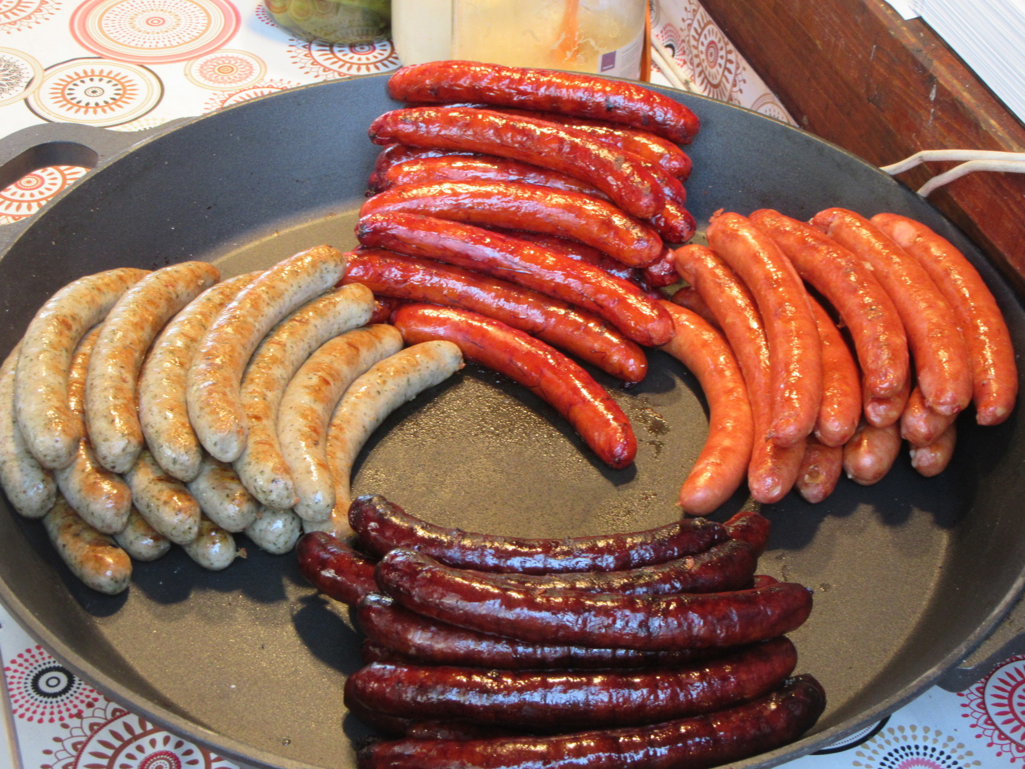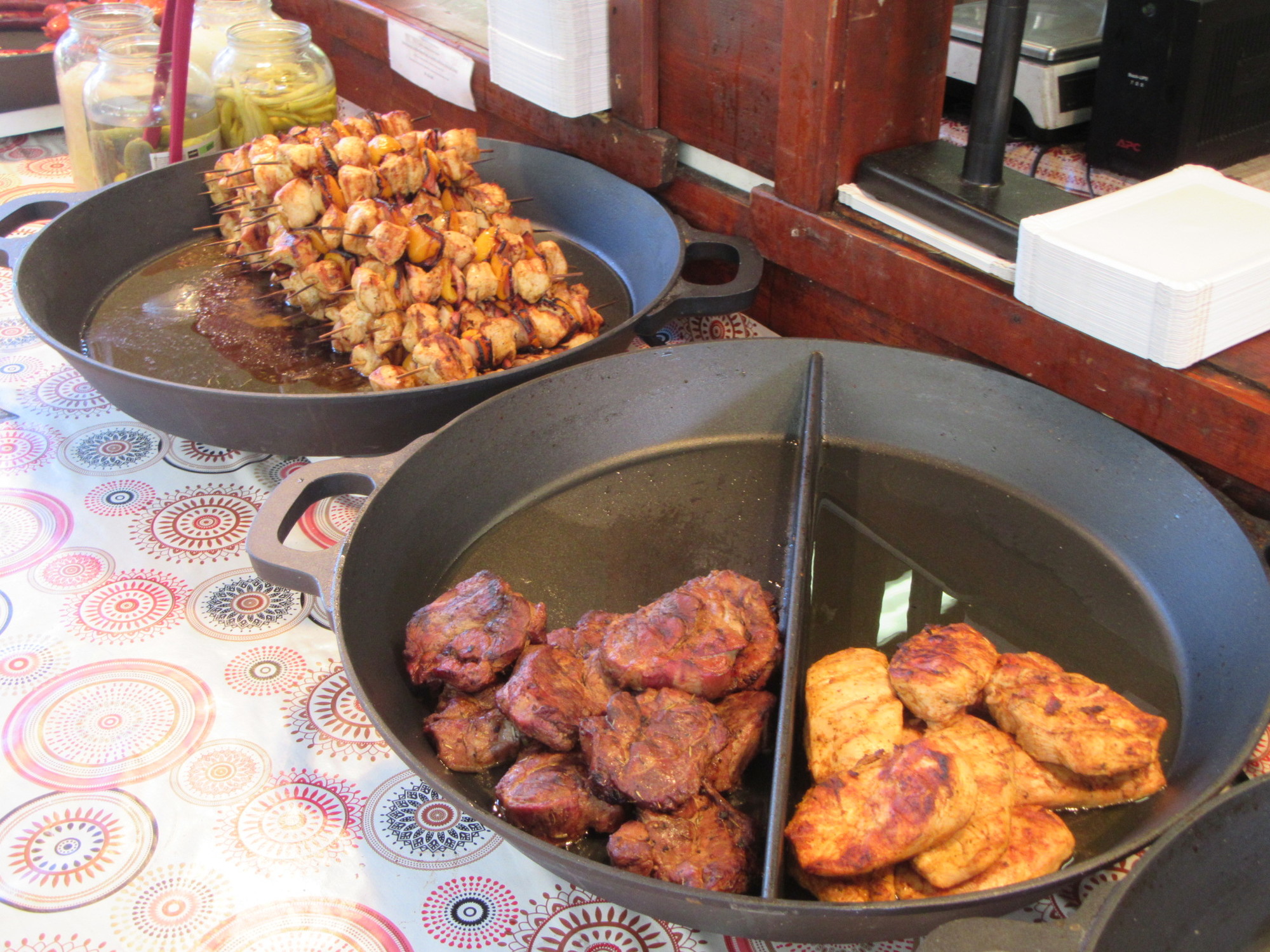 The next big thing on offer today, was all sorts of meat things cooked on charcoal, or wood fire BBQ. There were sausages, and notably, big hams. We saw people who had bought some of this, and seemed to be walking away with 1/4 pigs on their plates. Then there were also traditional dishes - like potatoes, or peppers, prepared in large woks. Have a look: