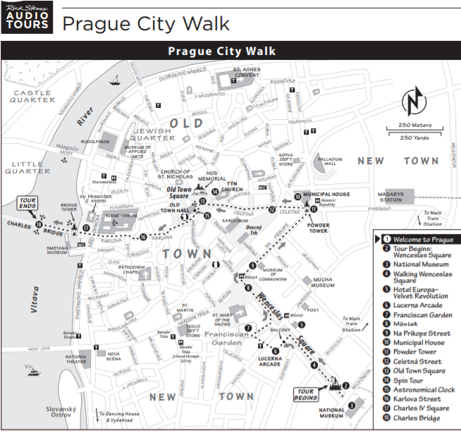 As you can hopefully see, Rick has about a dozen key things to visit, although he does not actually include the Jewish Quarter in this proposed track. Mindful of Dodie's past walking problems, I proposed dropping not only the Jewish Quarter, but also the hyper famous Wenceslas Square. Dodie felt she could do the whole Rick thing (which is actually double, because our hotel is right at his start, so it would be an out and back), so our start (and end) would be Wenceslas Square.