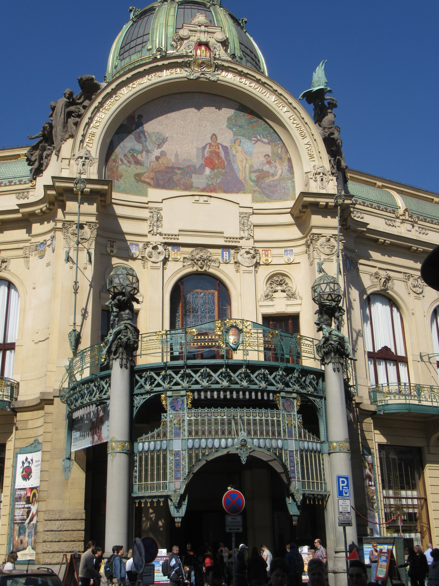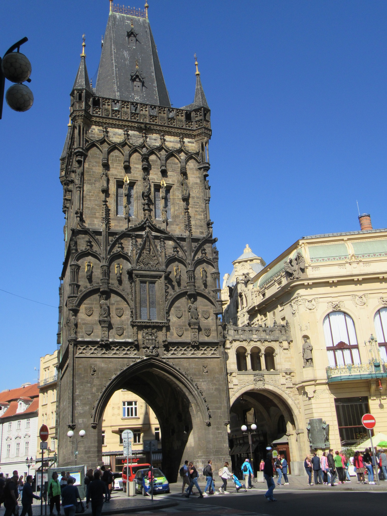 We found the map fairly easy to follow, and successfully cut across from the bottom of Wenceslas to the Powder Tower. With all the people around, we wanted to take care not to lose each other. Our yellow garments help a lot, but we found we also had to hold on to each other. At the Powder Tower, though, I left Dodie in order to cross the street for a better angle. But from that position I spied the facade of an opera house. To get a better angle on that, I shifted down the street a bit. Fortunately, I came to my senses in time to find Dodie again!