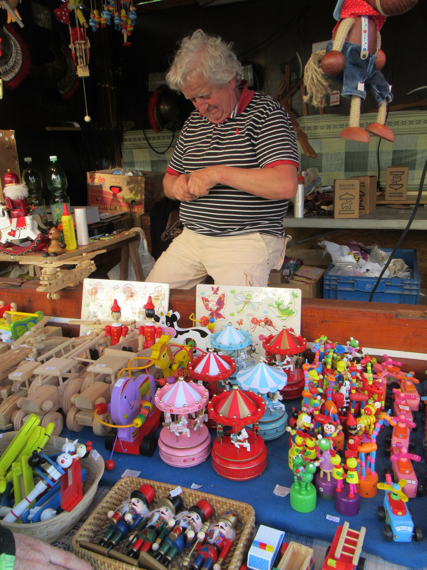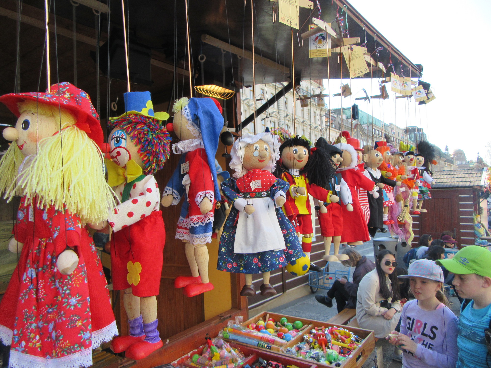 Another category we noticed was puppets. These are referred to by Rick Steves as "kitchen witch" marionettes meant to hang in your kitchen for good luck. Here are some hanging at a stall: