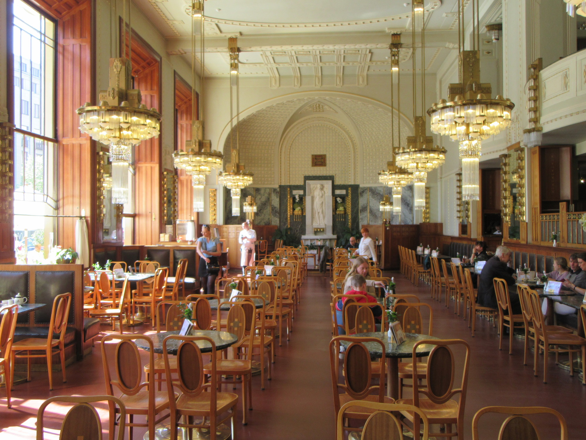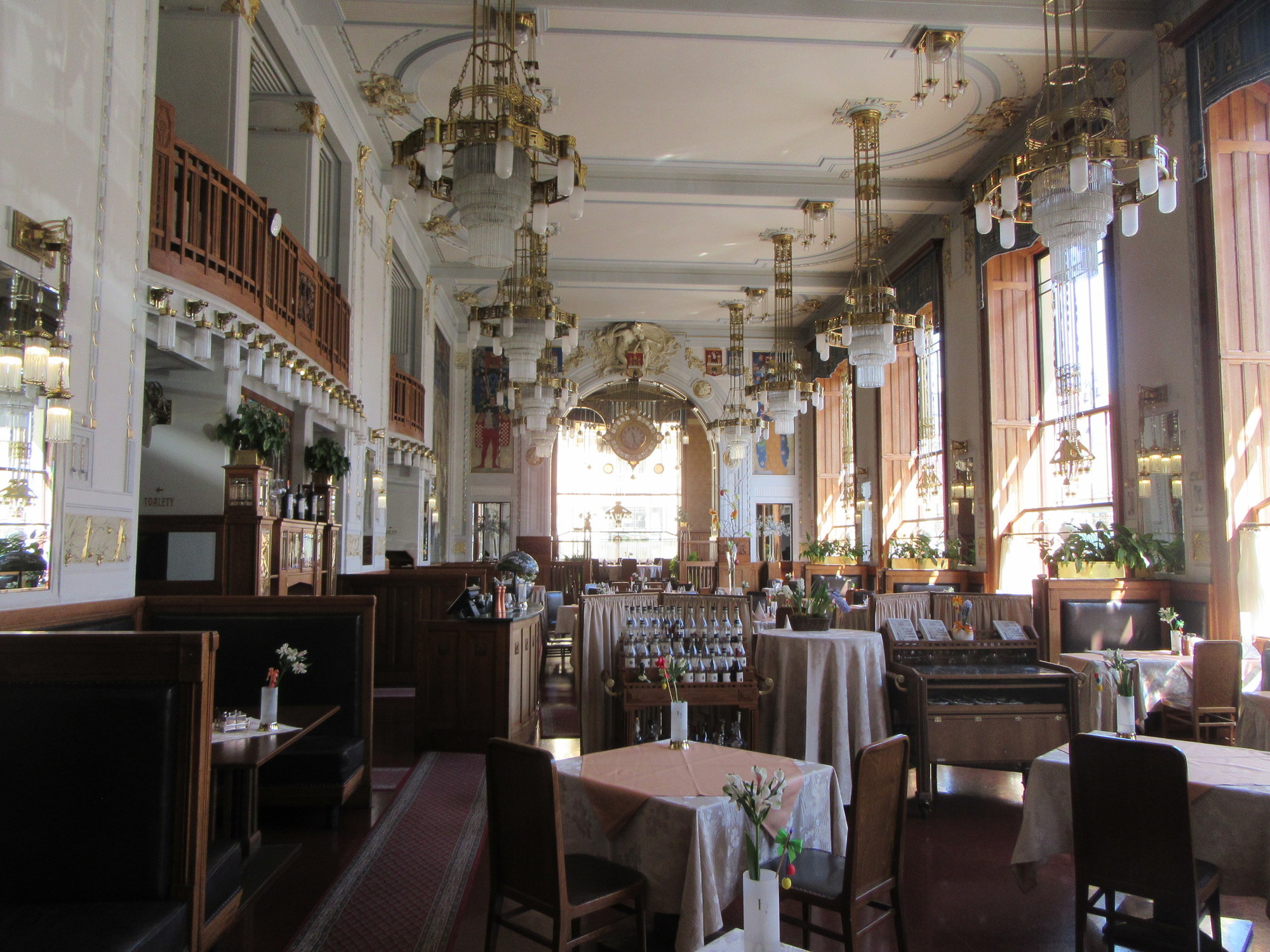We wandered in to the Opera House and found that it also contained a cafe and a pub. I peeked into the cafe, whose food services are presided over by some sort of celebrity Czech chef, and wondered if I could drift in for a photo, not thinking that a humble cyclist could actually sit at a table in there. But wait, they had a torte and coffee special! Soon we were seating in ultimate luxury!