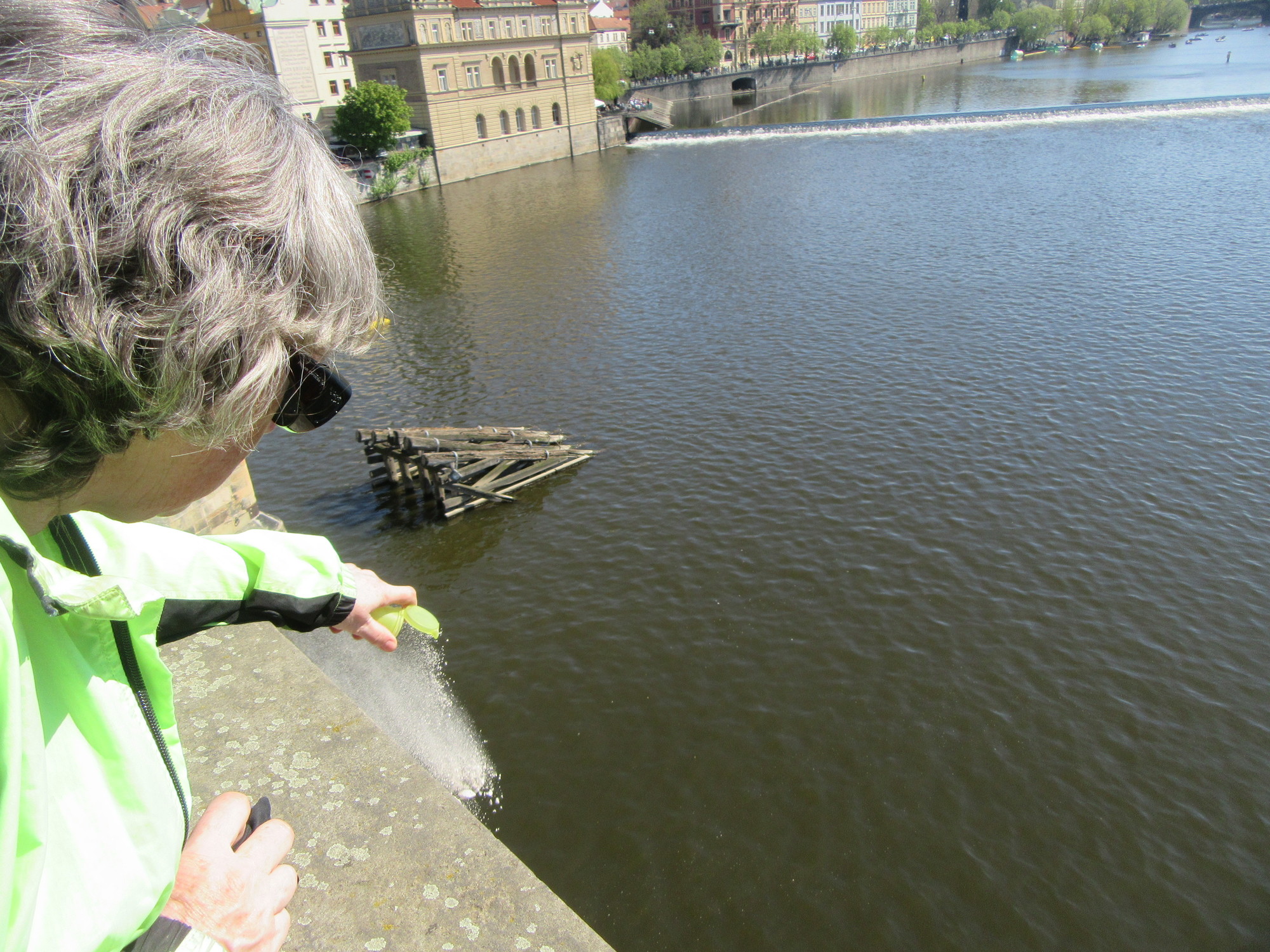 With this bold plan in hand, we gathered up our stuff, carefully deciding on what clothes to wear and to bring, what devices, what back pack, and with spring in our step, off we went. We got about 1/2 block or less, when Dodie reported some kind of pain or abrasion in her shoe. Maybe friction? We went back to our room for some bandages and set off again. After 1/2 block, Dodie reported that the maps had been left behind on the last return. I got to run back for those. But the foot was still not right. Further research turned up a small thorn, a remnant of rural Czech. So here, my first photo of this artistic marvel of a city, is of my own finger, showing thorn.
