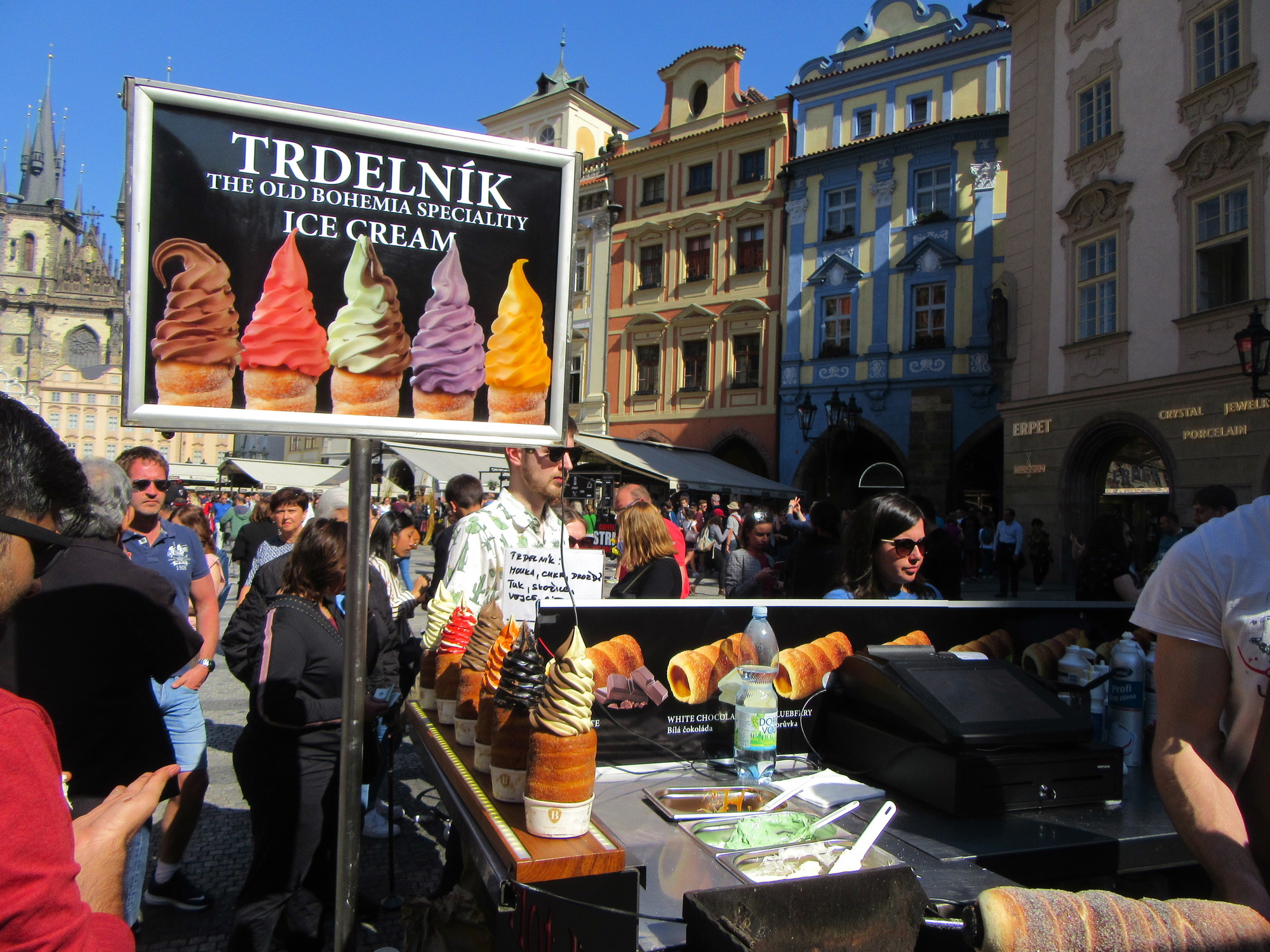 One of the main things, seen throughout town, has been the Trdelnik. It's a coil of dough, cooked on a special rotating pipe above coals. The resulting cylinder is then eaten plain. or filled with ice cream, in ever fancier decorated or flavoured versions. We of course tried one, with plain ice cream. The price is 125 Korunas - 5 euros! But oh, the one we tried! - the Trdelnik itself was very flavourful. Now in our case the ice cream was just in a paper cup jammed into the cylinder, and was one scoop. But this ice cream was truly the best I can remember. It was so obviously a simple frozen custard of cream, eggs, and sugar, fast to melt back to something like cream. No fillers, no milk by-products, no butter oil or other North American dreck. I could have just kissed those Trdelnikers!
