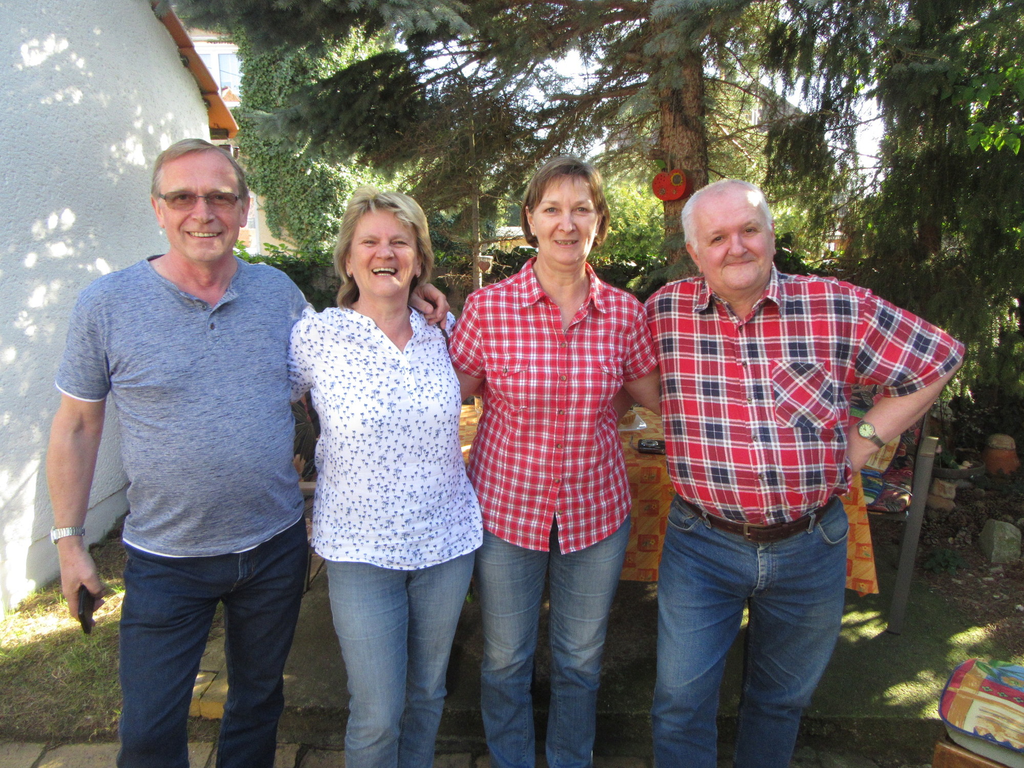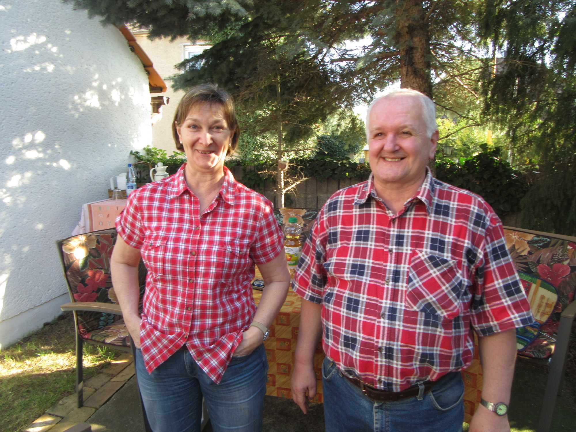 We toddled back home, but soon set off again, this time for the home of Karla and Joachim (Joe), Marius' parents. Karla and Joe sat us in the shade at their place, and Karla brought out far more of baked goods than four people could eat in a week. Actually, they will have to work on it, because they are leaving for a Canadian trip in four days! The baking included Leipsig "lerchen" which is a true local specialty, being a "kuchen" with a centre of marzipan.