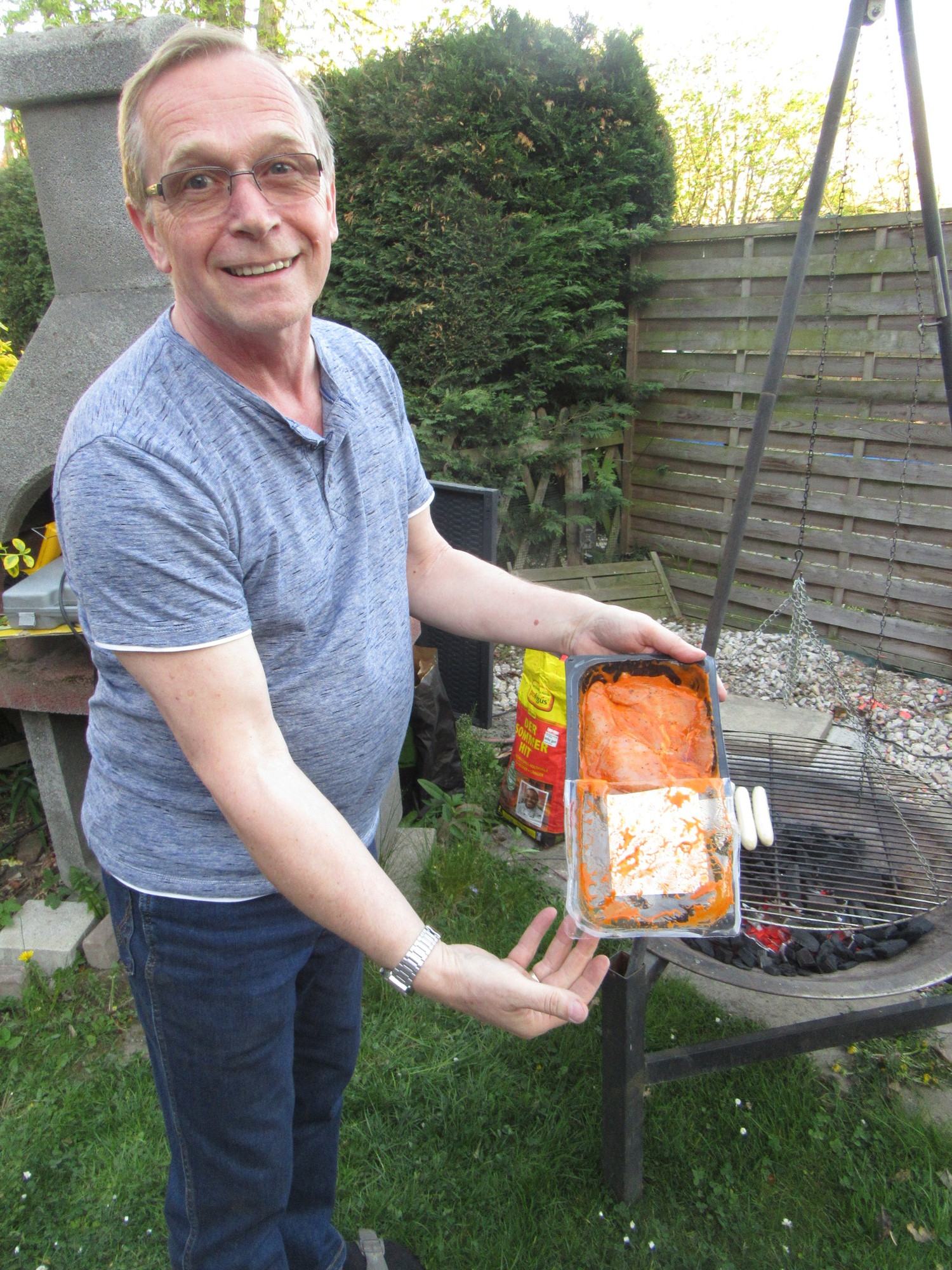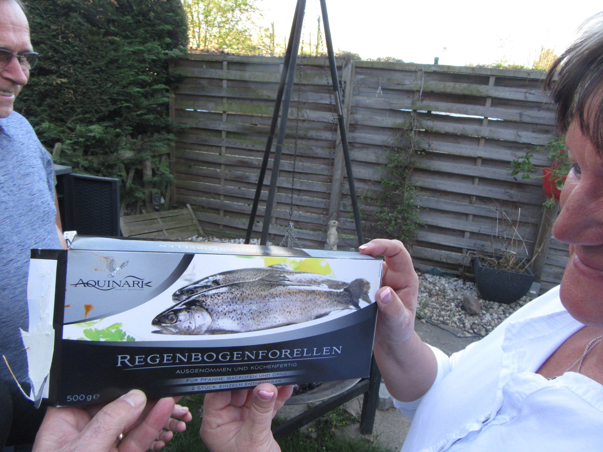 Jurgen had assembled a variety of meats to go onto the charcoal, including marinated pork, chicken, weiss wurst, and a kind of cheese made for BBQ. The chicken was, yes, Hähnchenbrust, spawning another round of pronunciation discussion. Once we were at it, we analysed some other of the meat packages, like the rainbow trout - Regenbogenforellen!