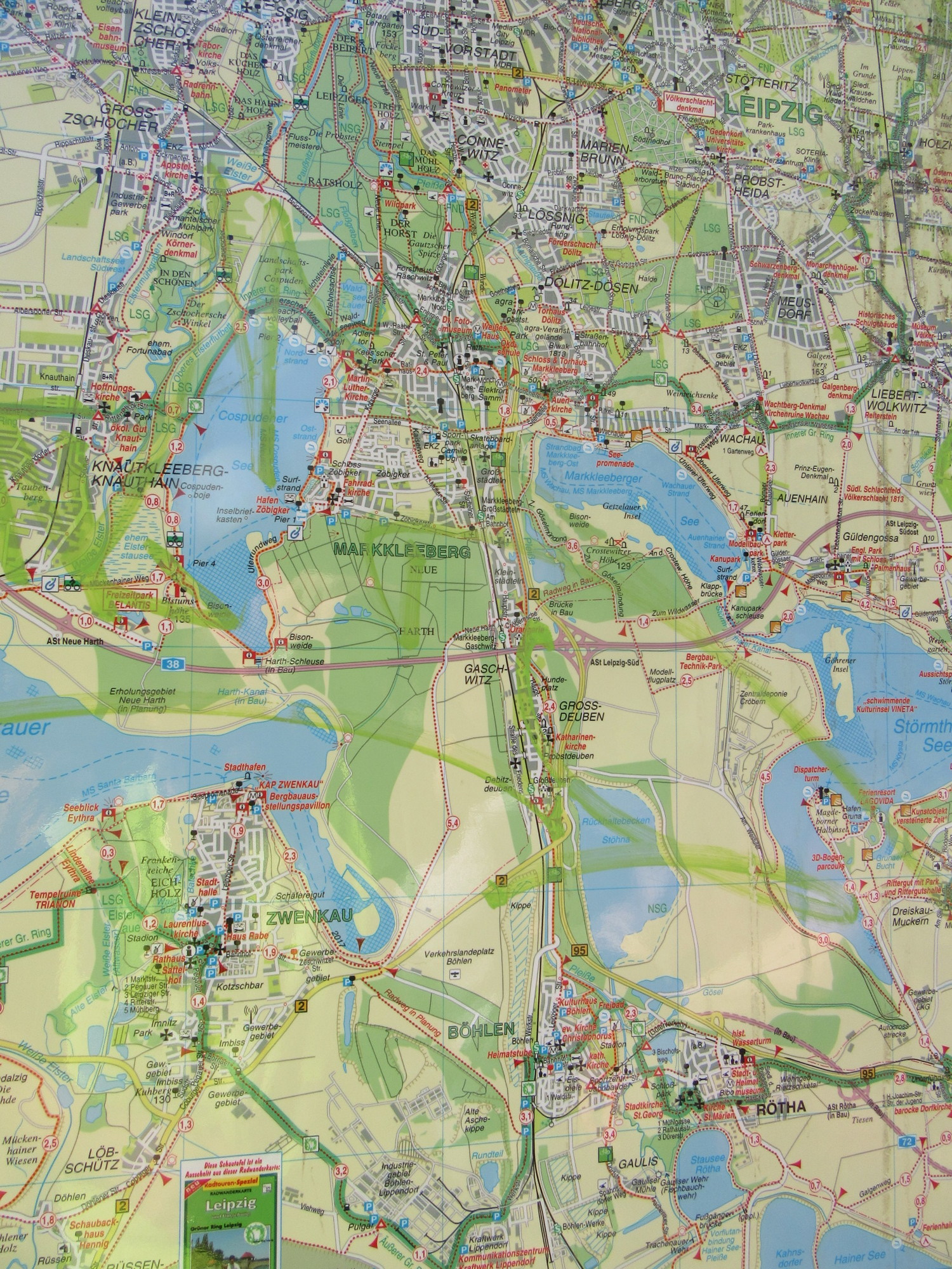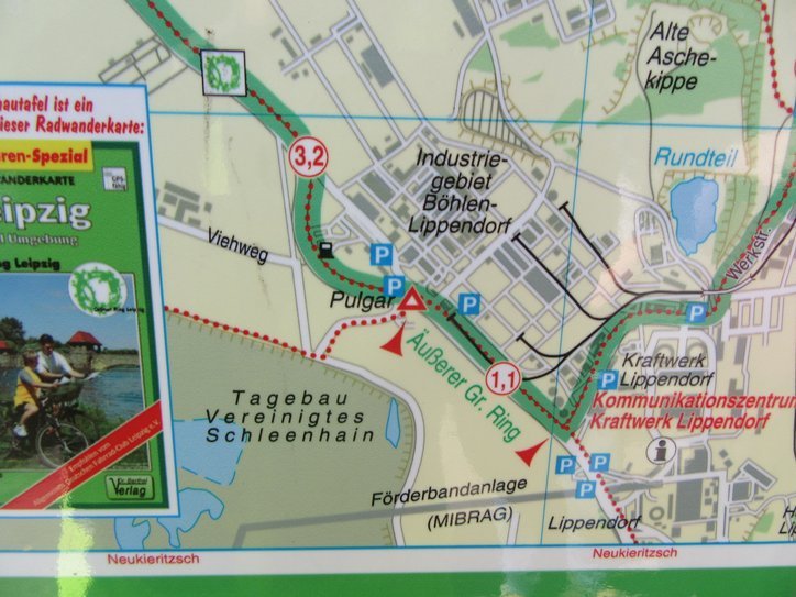 Despite it all, Leipzig still relies on coal power. The map shows the power plant and remaining mine. Kraftwerk is an electrical plant and tagebau means open pit mine.