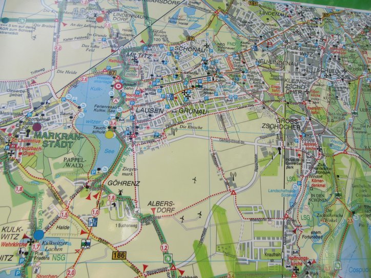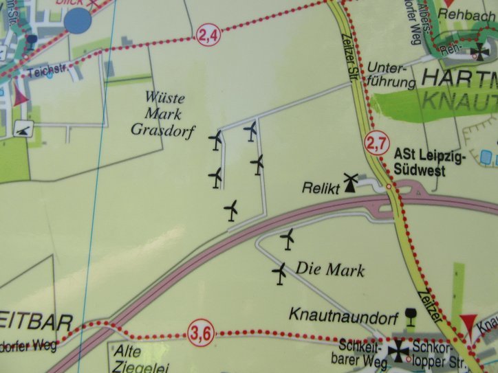 But the ma also shows wind turbines. Some turbines are at the BMW plant north of town. The plant is making electric cars. There is also a large Porsche plant in the same vicinity.