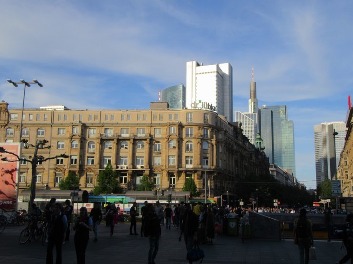 Out of the train station, yes, there stood Frankfurt, with some of its signature tall buildings.