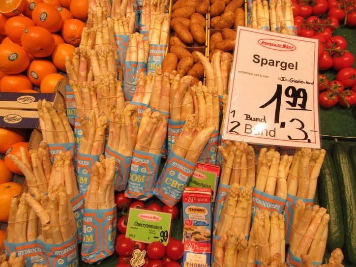 The station itself has take advantage of its location and has installed a fairly serious shopping mall beneath its main level. This is something we have also seen in other cities, such as at Montreal's Place Bonadventure/ Windsor Station. I guess one difference to us is that here in Germany the mall contains quality goods. Of course I noticed that in the bakery category, and tried to snap some farewell shots. One other shot was of some white "spargel", which we were only able to sample once on this trip. Jurgen made me feel "better" by pointing out that the spargel I was drooling over was not really fresh, being not local but product of Greece.