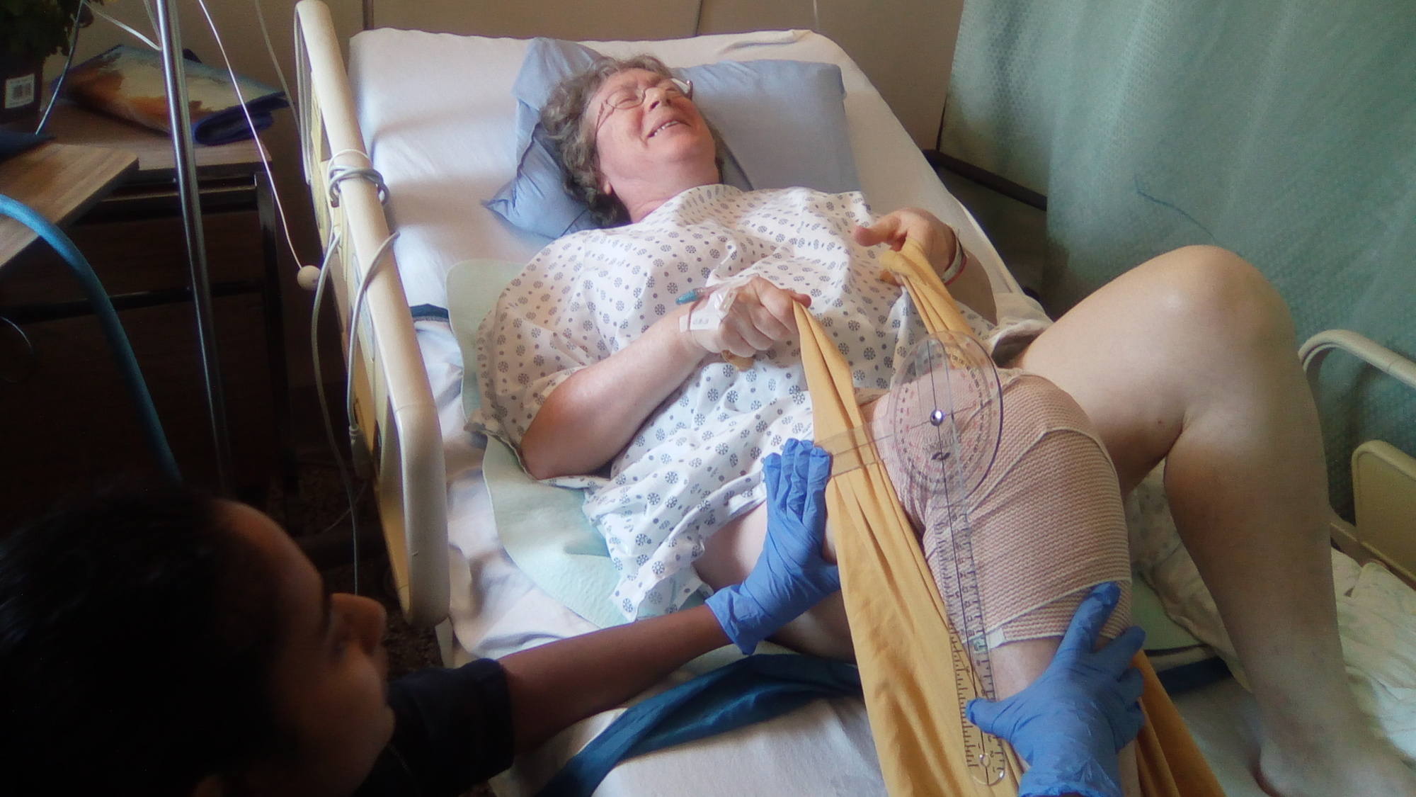 But someone did come, and they started off with the 'kindergarten" exercises - the ones in the book for before the operation had even happened. The main one of these is to be lying down and to use a towel or sheet around the ankle to pull the knee into a bend. After a bit they got the knee to 89 degrees - a good start.