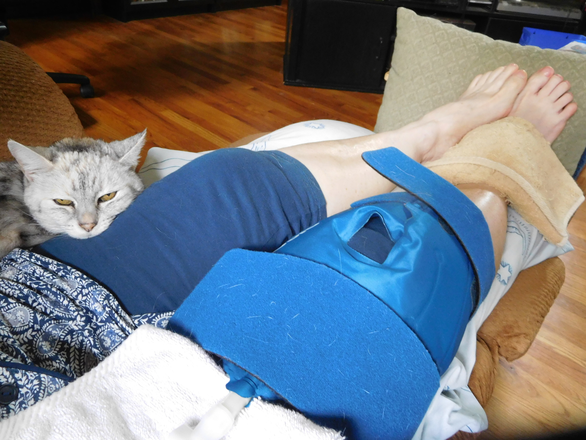 Still, we have some tools to use right now. Jessica showed me how to massage one of the tight muscles. And we found that heat on the ankle helps, even while there is ice on top of the knee and beneath the calf. And finally, there is Fleurie the cat. Cat's radiate invisible healing waves, as everyone knows!