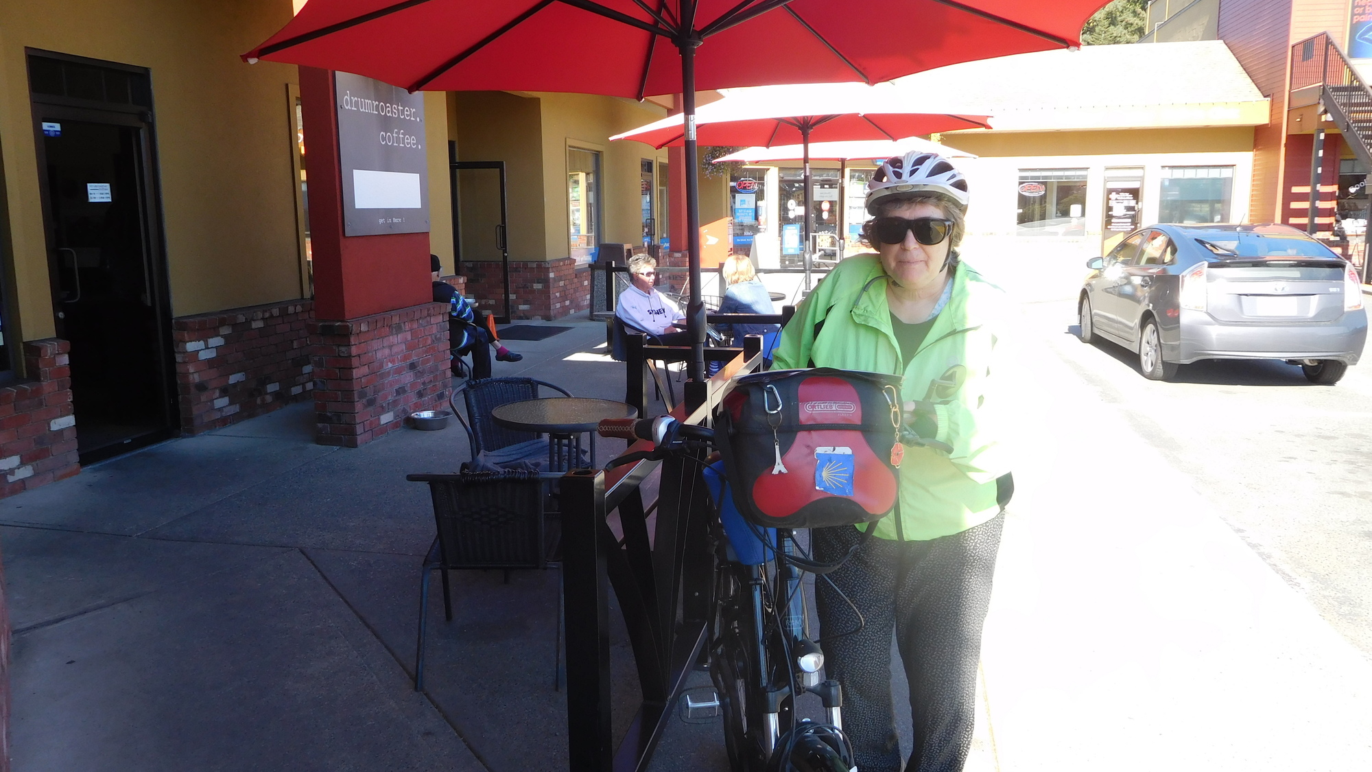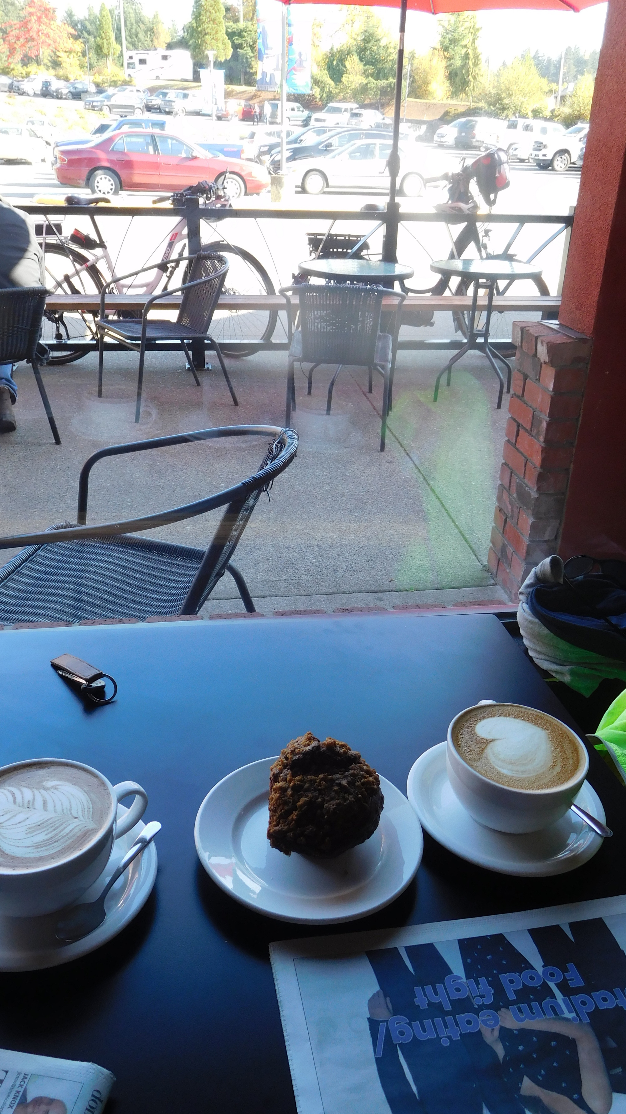 As the latest pain killer and antibiotic prescriptions wind toward their last days, Dodie is out on her bike again. The target, just like on a "real" bike ride, is a coffee shop. In our case, it's called the Drumroaster. It's really an excellent place, that roasts its own coffee and has a small but decent selection of baked goods. The distance to Drumroaster is 6 km. If you make it, and like Dodie - don't like coffee, then you get their "Hugs and Kisses" tea drink, and a "Chunky Monkey" chocolate and nut muffin. Hopefully restored, it's then 6 km to home. So that's 12 km total. So what? So 12 km is a big deal!
