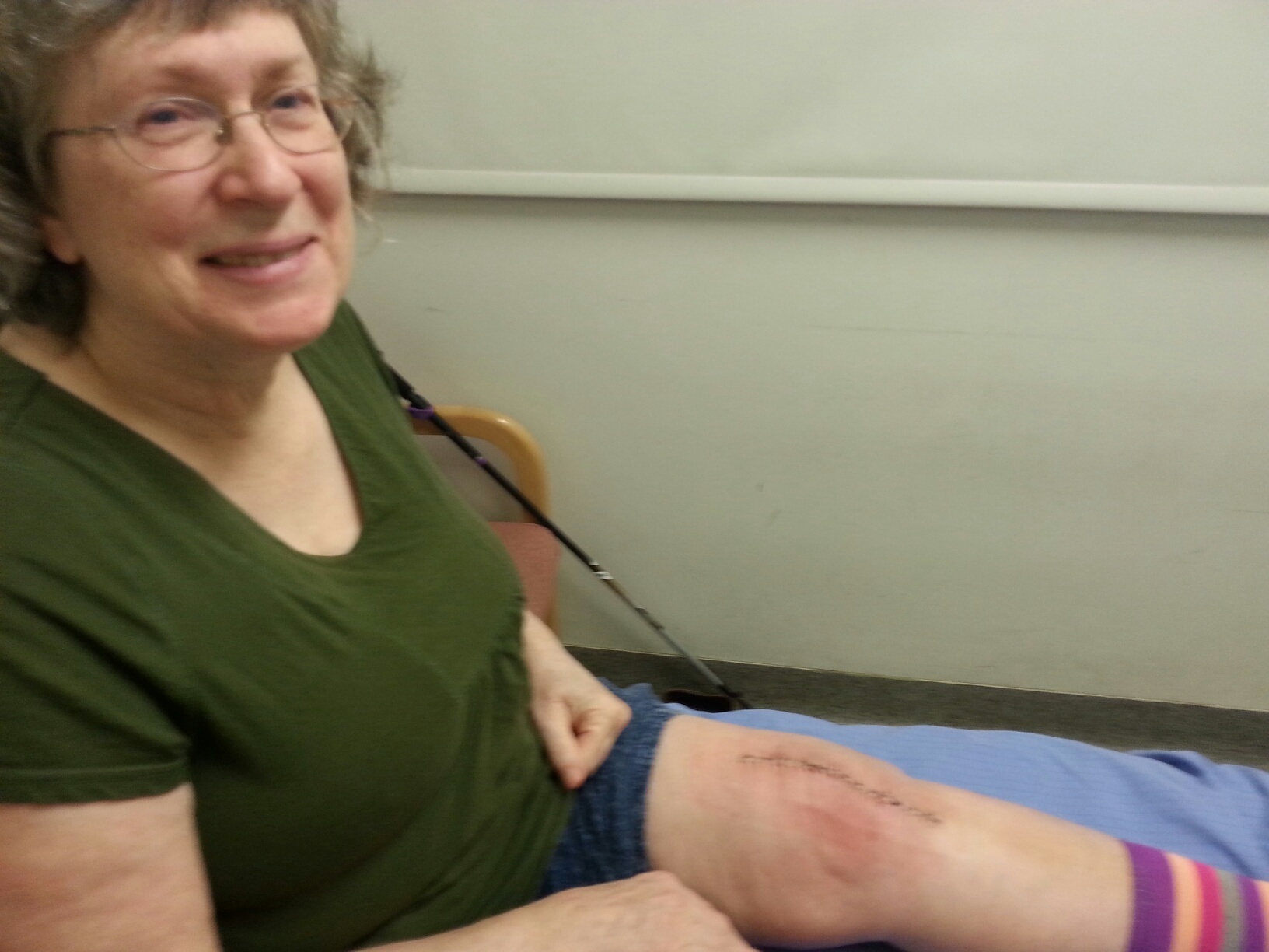 To be sure, the leg is still swollen and kind of gross looking. But it bends, and discomfort is more like a pulling than deep hurt. Dodie looks pretty chipper about it: