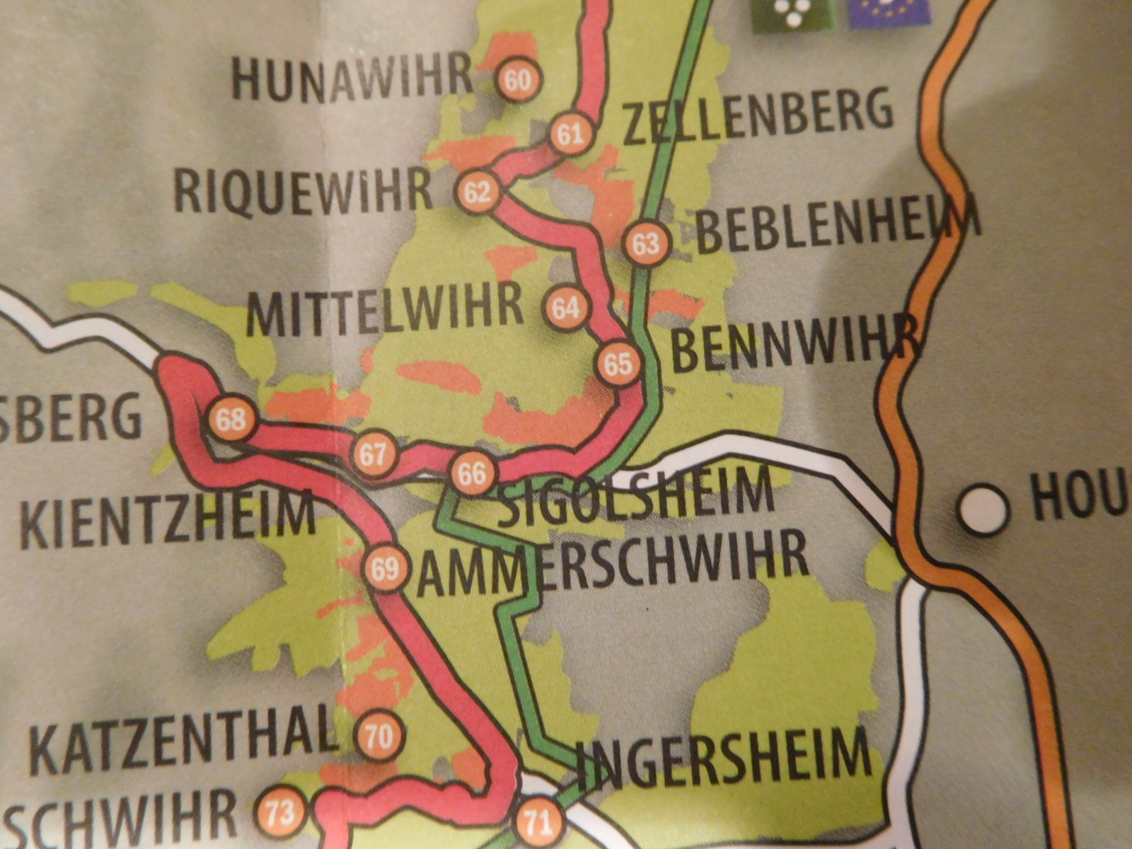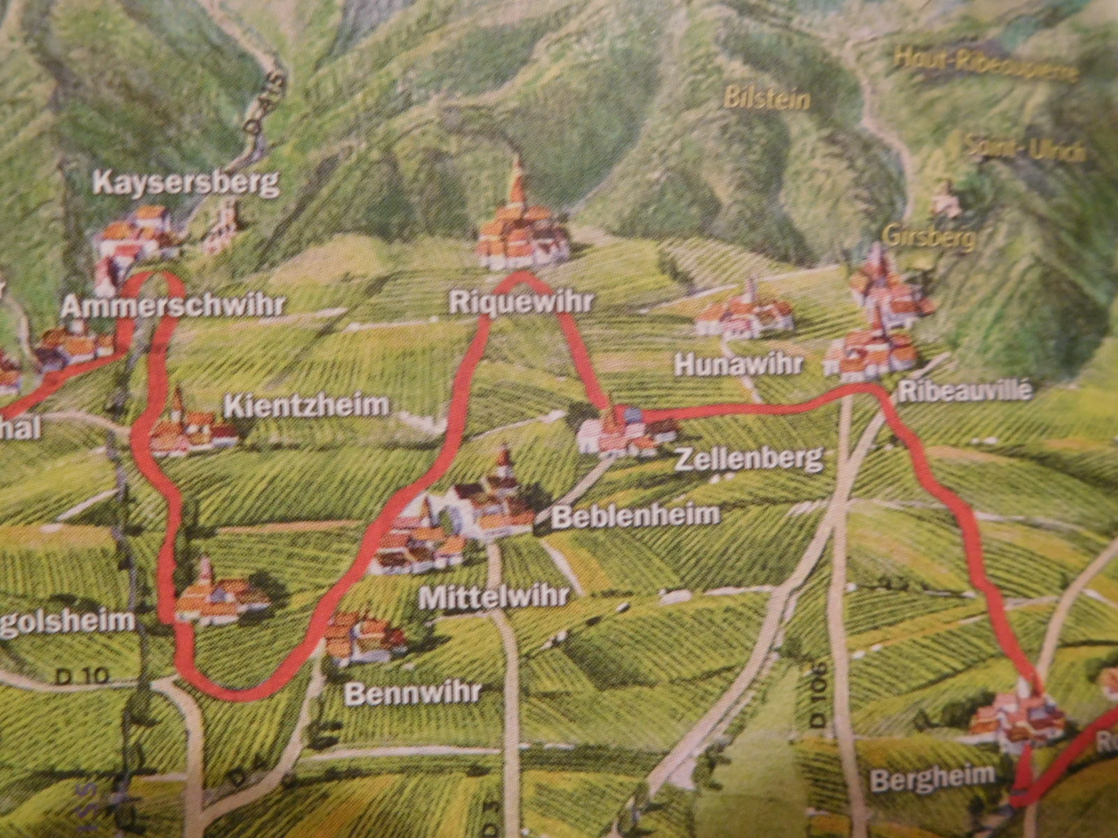 Very roughly, between the Vosges and the river is about 30 km. Nearest the mountains there are of course slopes and also the valleys of Rhine tributaries. The slopes and valleys shelter about 100 wine villages. Among these are about 50 areas designated "Alsace Grand Cru". That's a big deal (especially if you like wine!). A route has been set out that visits each village, but you would have to be a zealot to go up all the side valleys. Instead there is the "Veloroute du Vignoble", which is still obviously the wine route, but which takes a sensible path that does not try to go everywhere.