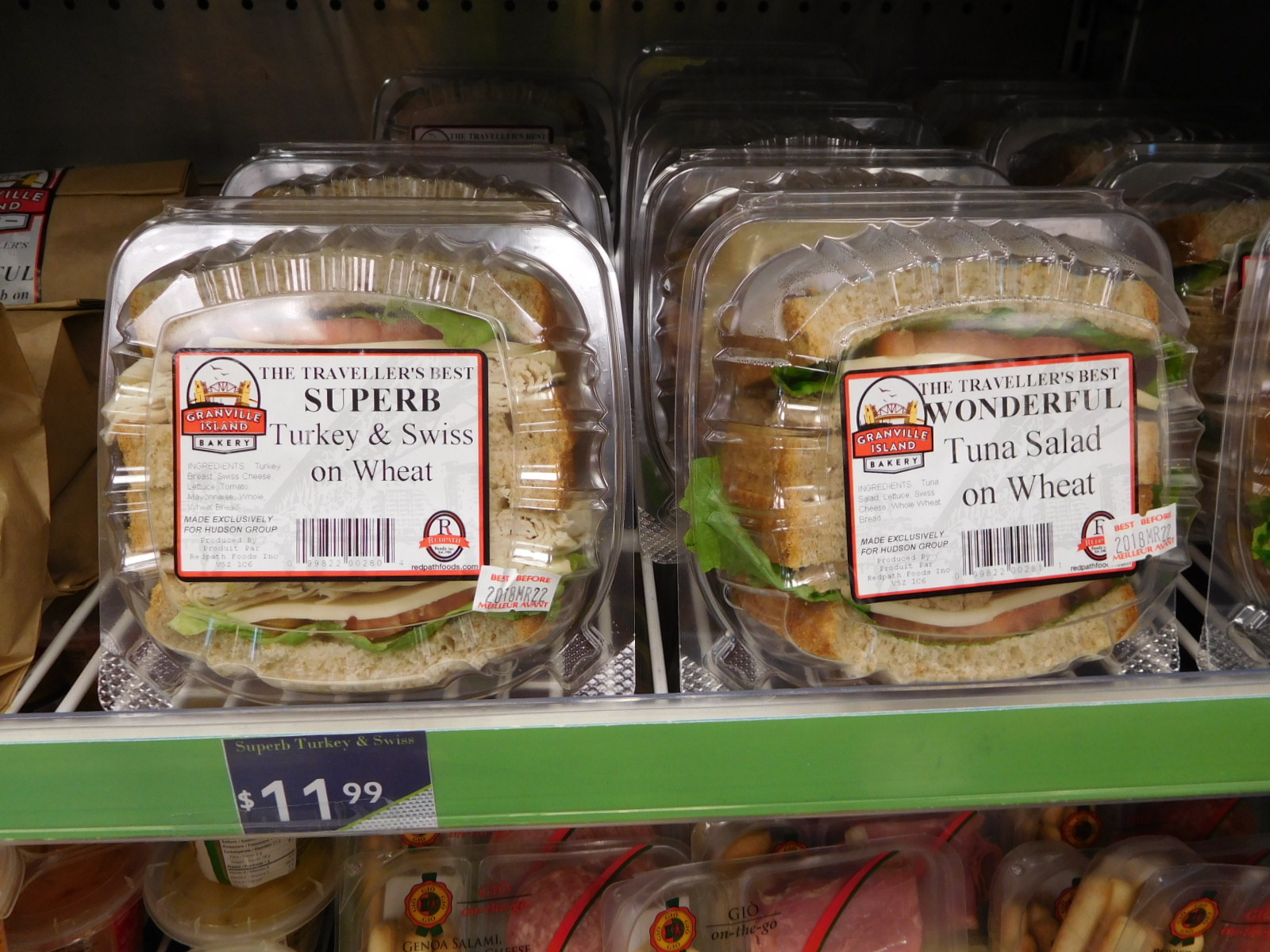 On the other hand it takes more pre-planning than we are capable of to actually bring food from outside for the hours in the airport and plane. Since airlines (especially Air Canada) have given up on supplying free food during a domestic flight, you have the choice of buying on board or buying near the gate. So off I went to look for a sandwich near the gate, at the "Euro Cafe". Euro Cafe wanted $11.99 for a tuna or turkey sandwich. I felt that was about twice the "street price".