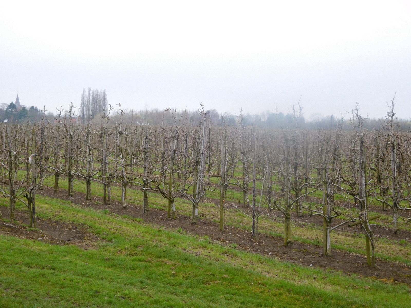 Aside from well trimmed hedges, the area we were passing through featured well pruned fruit trees. This was significant to us because of something from Montreal. While we were there Sabrina happened to buy some apples that she has found are really good at this time of year. They are called Red Prince and come from an accidental cross of Golden Delicious and Red Jonathan. This happened near Weert, Netherlands - a town we passed very near today. The apple was brought by Weert residents Irma and Marius Botden to Canada, and they now grow them in Ontario. It did not seem that we were likely to find them near Weert any longer, though we did think about staying in the town to find out.