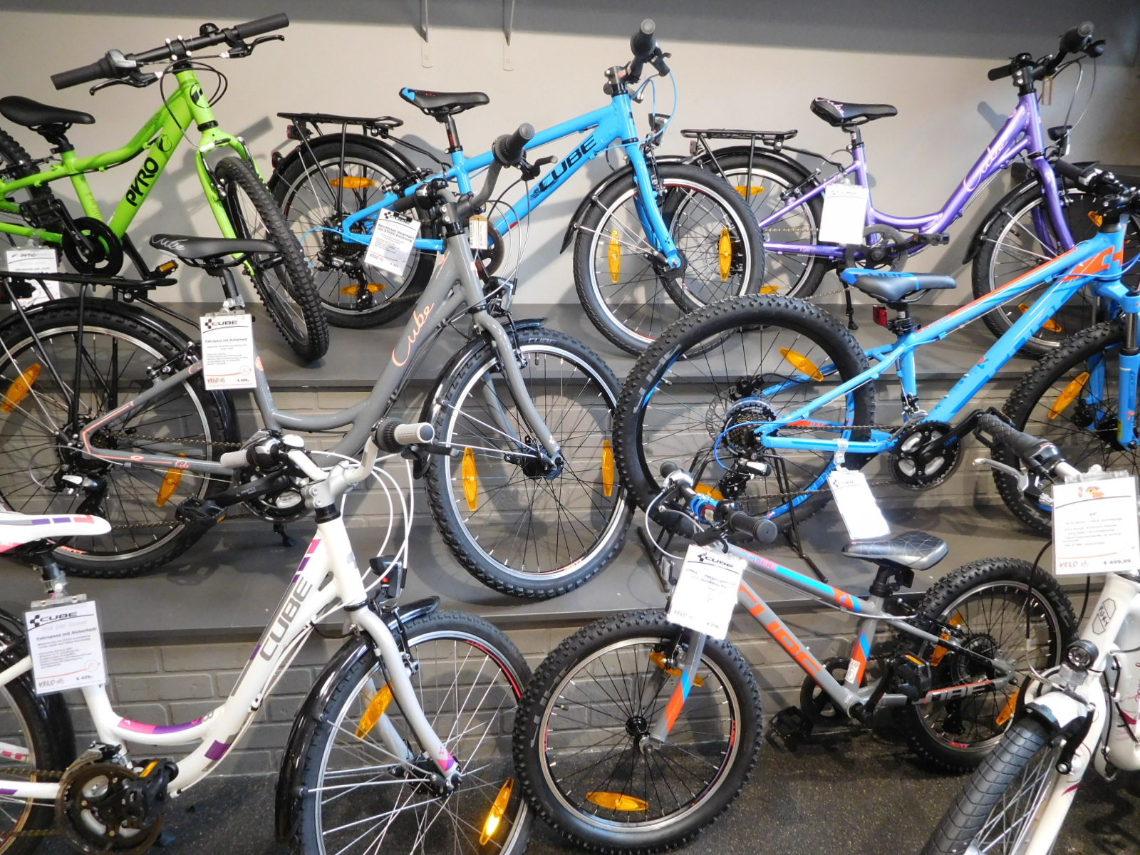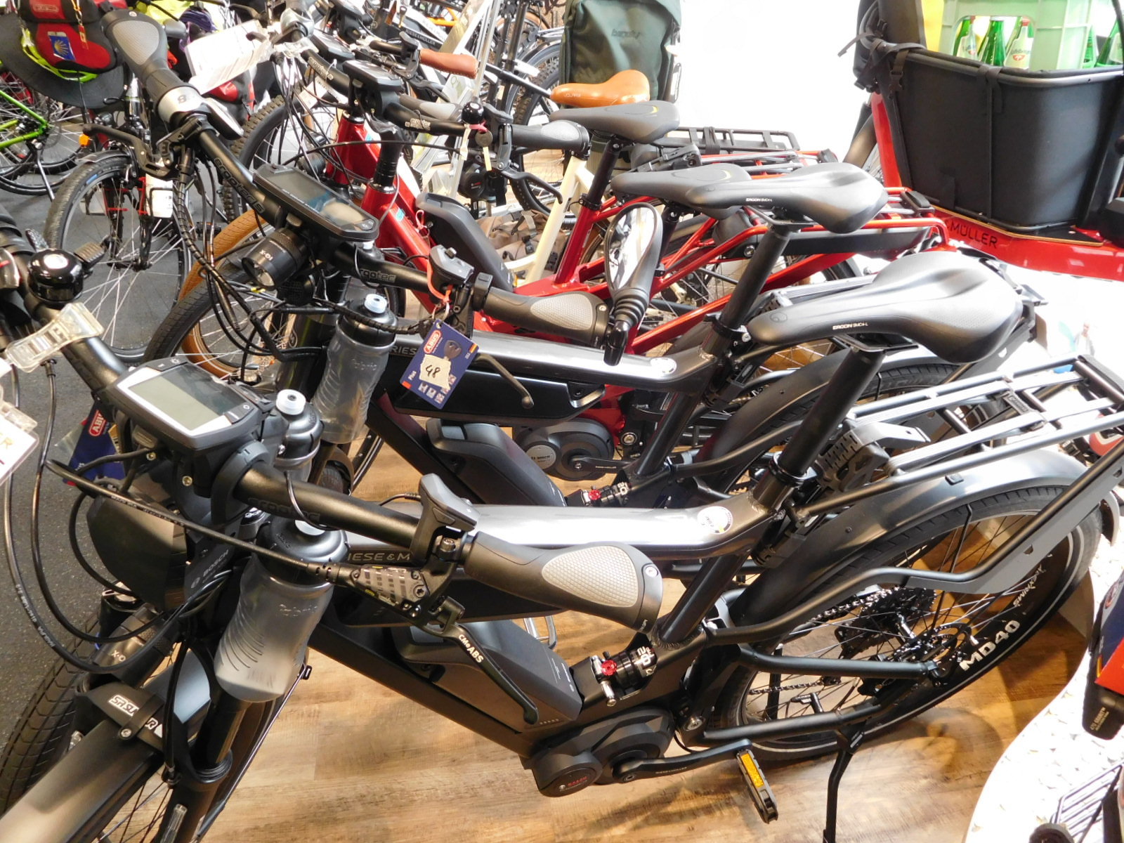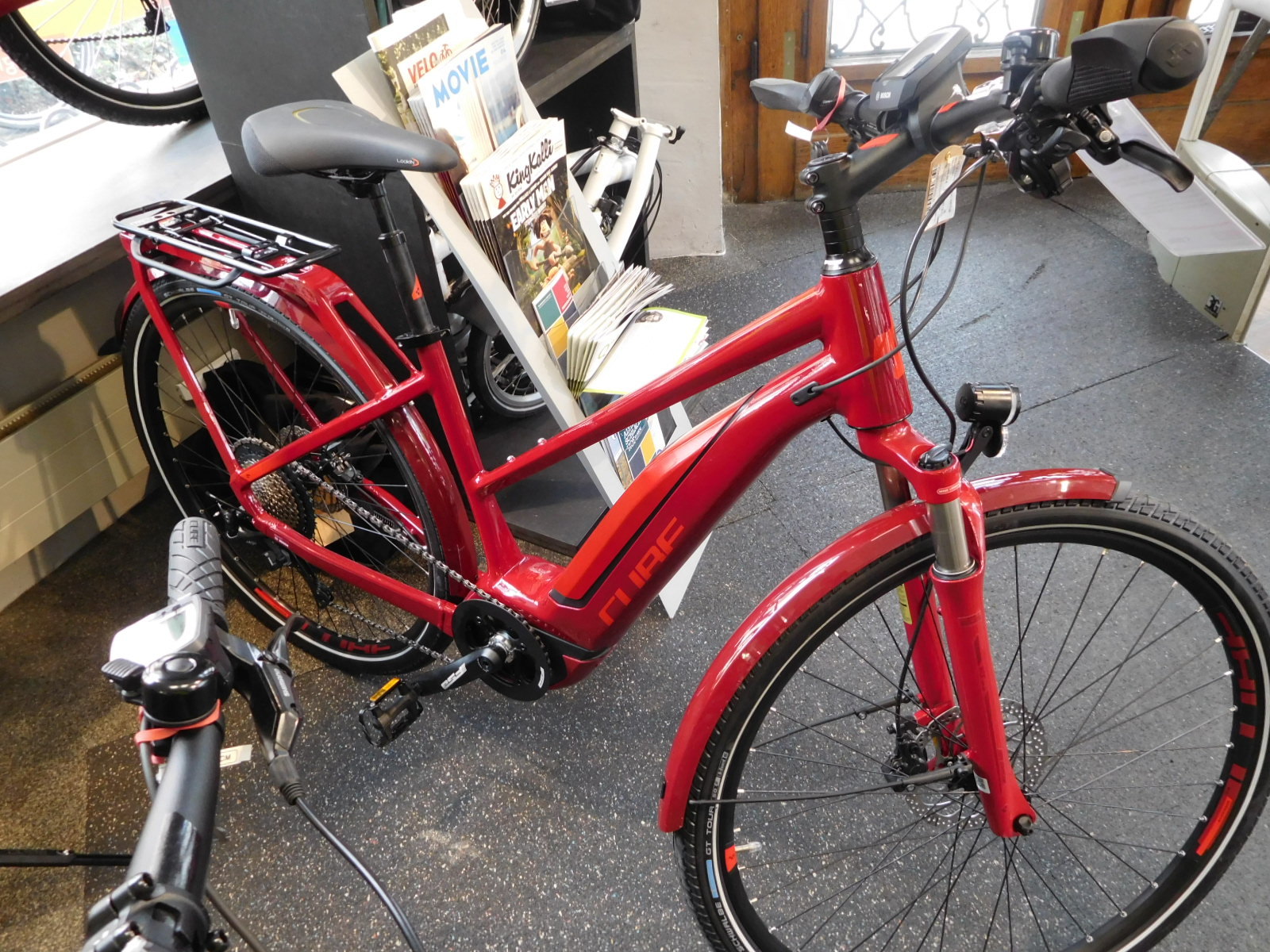 It certainly seems as if Germany has taken over as the number one place for the latest and greatest in bikes, displacing France and Italy. Maybe it's the monumental shift toward ebikes, that has affected the European industry so greatly. Well this shop was just stuffed with elegant examples of the genre. Reise Mueller seemed to figure prominently, but the coolest models, I thought, were from Cube. There was one little number with red frame and fenders and even red motor drive and battery. The staff said everyone likes that one!