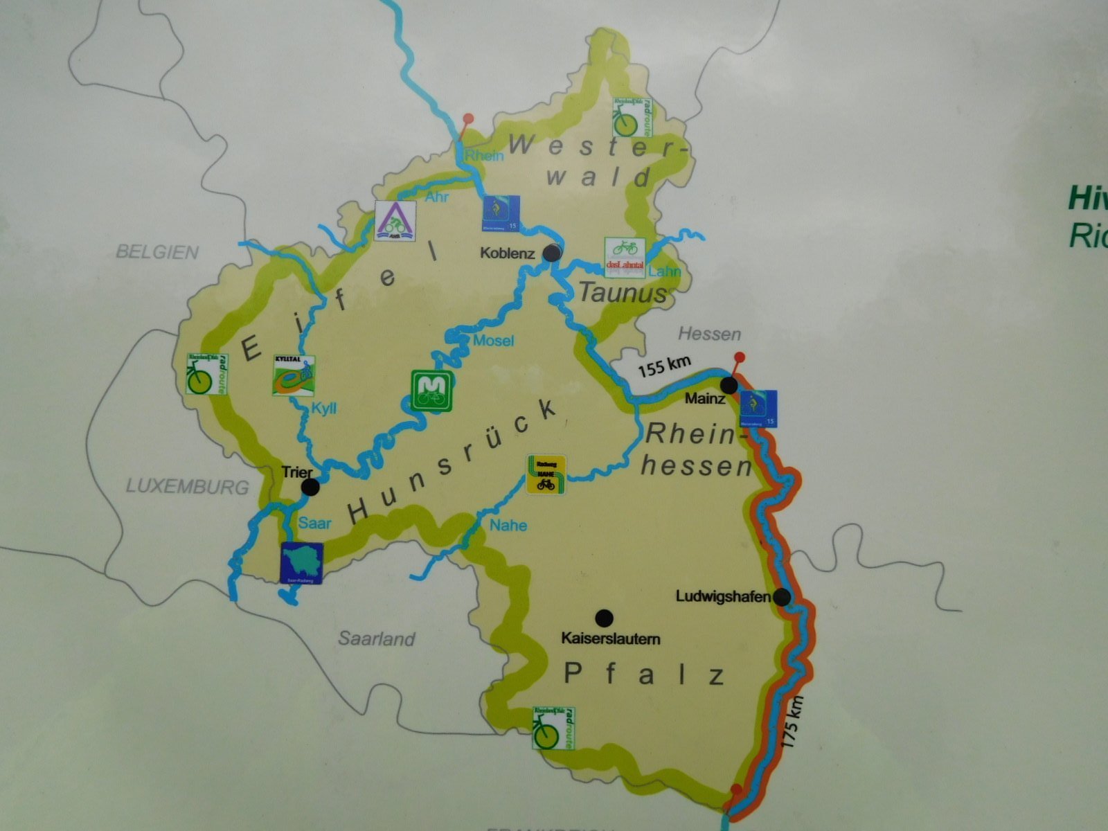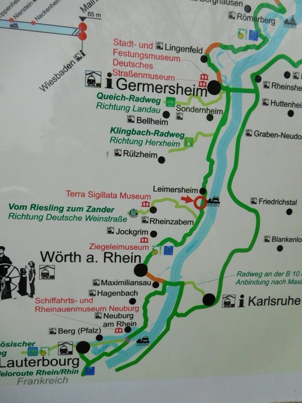 At frequent intervals along the way there were posters that described the bikeway, but also ones that suggested side routes. Basically any major stream that enters the Rhine supports a bikeway back up toward its source. We find these very attractive and need to dream up a way to include them in future trips. For now we are content to photograph the posters, which contain the web site references for further information.