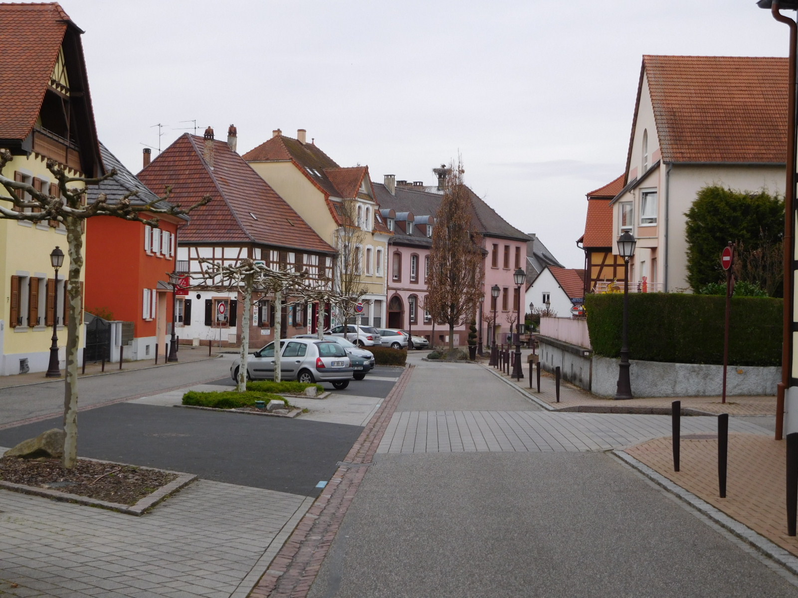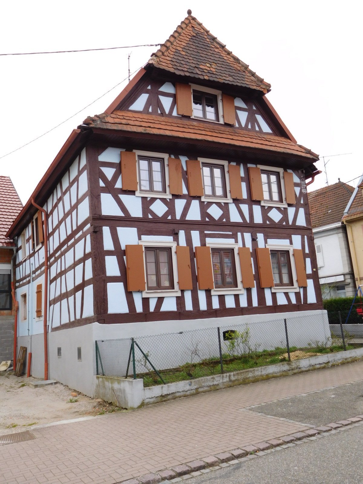 Our target for the day was the little town of Seltz, about 15 km from Lauterbourg. We went into the town centre mainly to see if there would be a source of food there tomorrow. Though signage had told us we were in France, maybe we could have also guessed it, because everything we saw was closed, including of course the Tourist Information office. We did spot the bakery, and to be fair its hours include an opening at 4:15 a.m., and though closed it would be open again later in the afternoon. The town itself was attractive, and had some "Alsatian" style buildings, especially one very nice blue one with brown trim. If you look at this one, you will see the roof direction change which earlier had appeared with the cuckoo clocks.