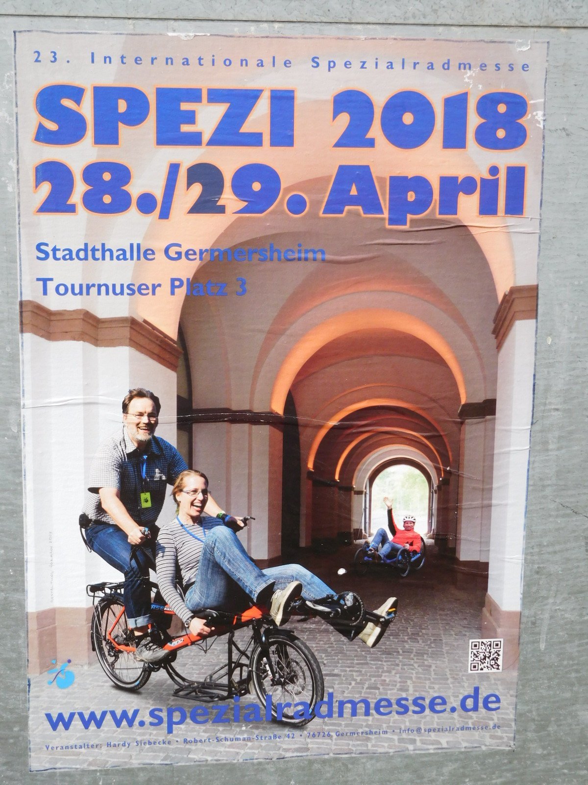 It had not quite dawned on us before, but Gemersheim s the site of Spezi, the trade show for special bikes, or as their web site says: "world's largest show for recumbents, recumbent tricycles, quadracycles, folding cycles, tandems, family cycles, velomobiles, transporters, electrical bikes, special needs bikes, adult kick scooters, child and load trailers, customised designs and accessories." This year the date is April 28/29 so clearly we will miss it. But if anyone is going, we recommend the Hotel Gemersheimer Hof!