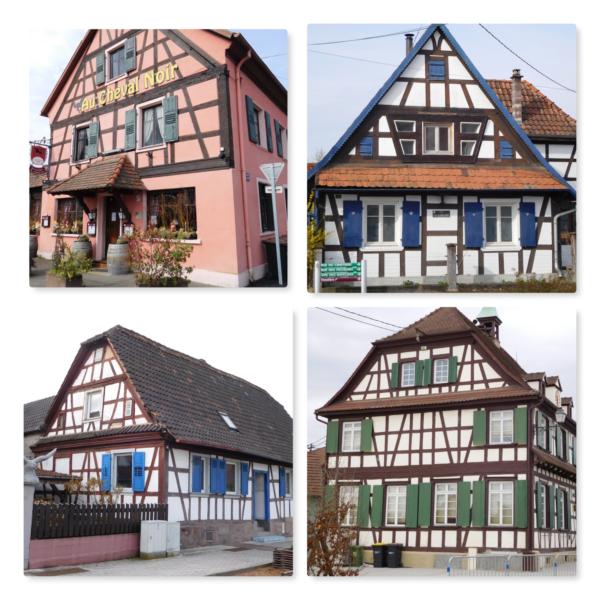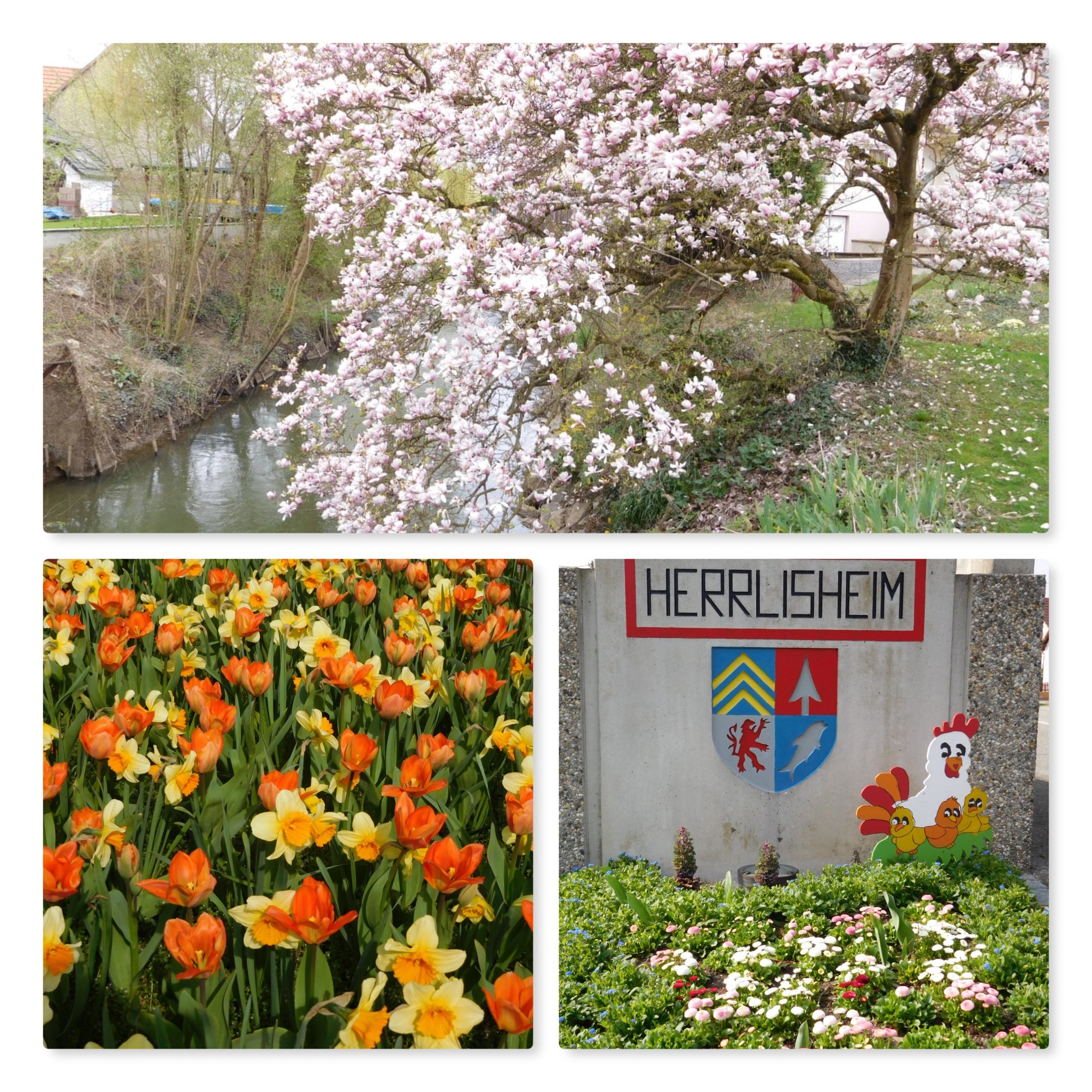 The main route to Strasbourg closely follows the river, and if truth be told we could have actually followed the river on the German side. But the signage actually took us on an alternate which cuts somewhat inland, through villages. This turned out to be a benefit because the villages were Alsatian ones, and contained a lot of regionally typical houses. Also, Spring is clearly continuing to come to the area and now we found beds of tulips in bloom, as well as blooming magnolias and other trees. Here is what it looked like: