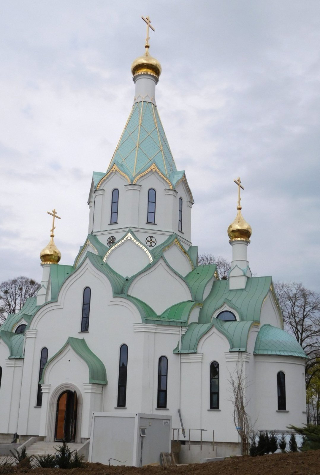 In Strasbourg the main attraction is the huge cathedral, with numerous carvings in the outside and dramatic stained glass visible inside. But before we arrived at the cathedral, in the centre of town, we came to a much smaller but also dramatic thing in the form of a Russian Orthodox church, still under construction. I had never seen anything quite like this, but I realize from looking at others in the internet that this design is fairly normal for Russian churches. I still think it is terribly elegant.