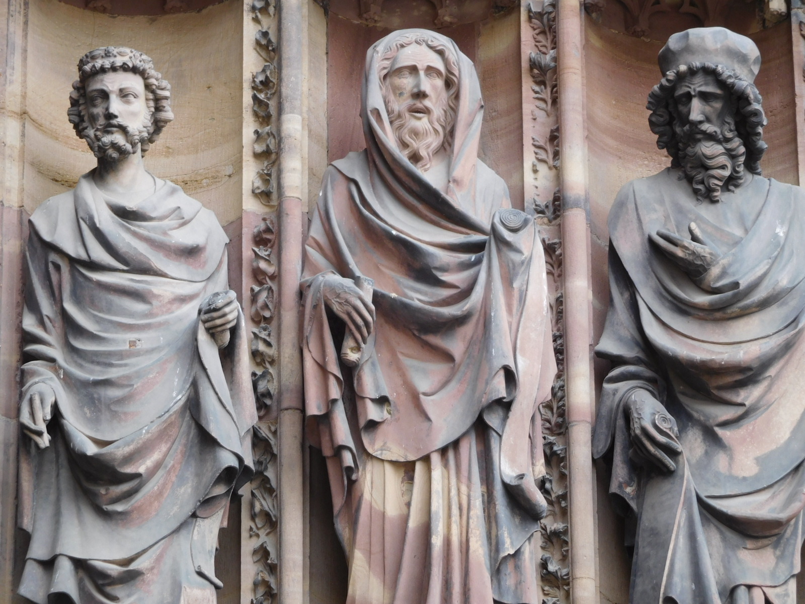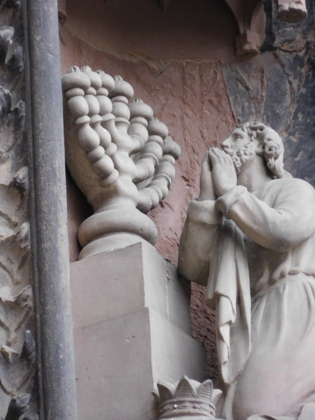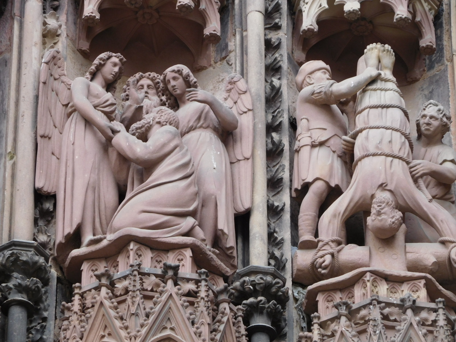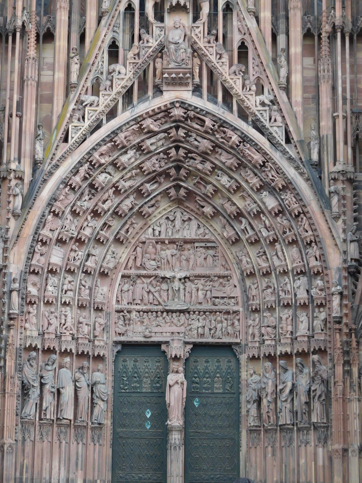 The Strasbourg cathedral is something we have visited before, but it is always impressive. As long or longer than the Speyer cathedral, it immediately strikes you with the elaborate carving on the outside. As is usually the case in the Roman Catholic world, the church and its various art forms sets out to tell the religion's main stories. So stained glass, carving, and frescoes are often like comic books. One thing about these "books" is that they often seem to portray themes and theology that you might not think were official church doctrine. There are often many sorts of mythical creatures, lots of sinners being pushed around by demons, and often - rather explicit naked people.