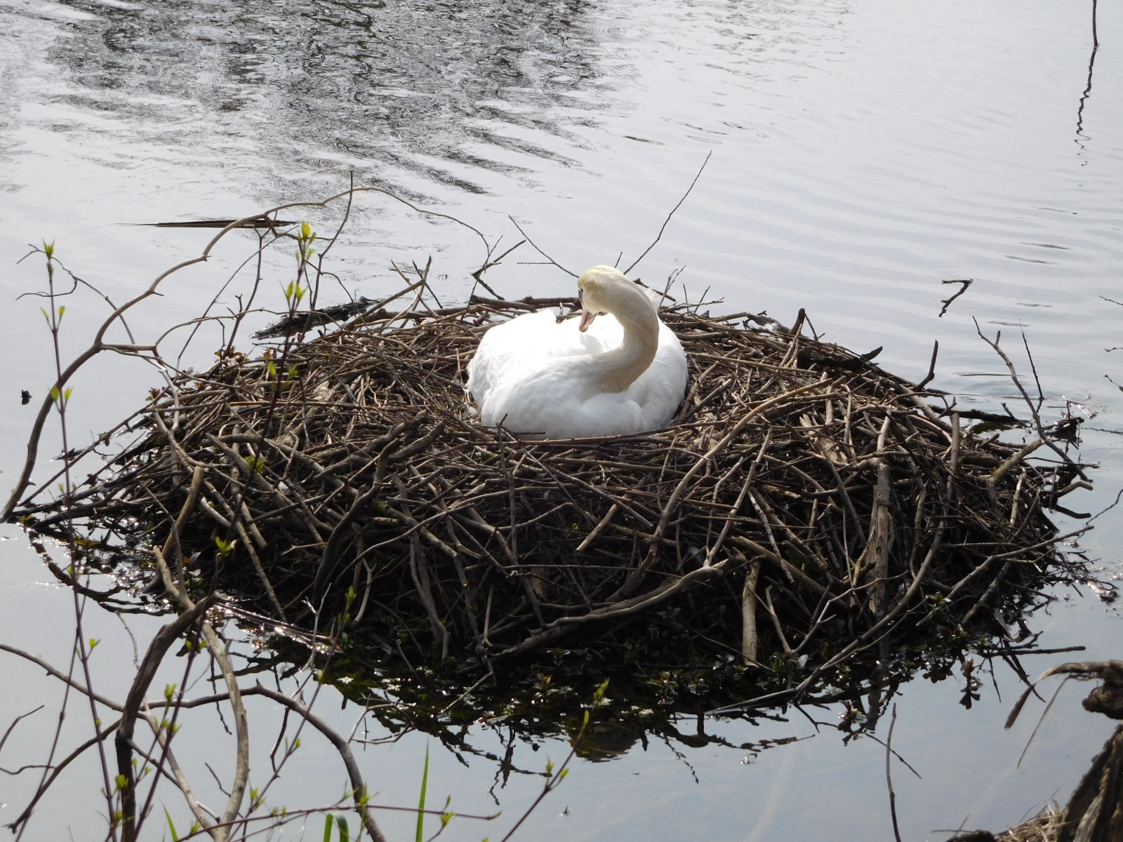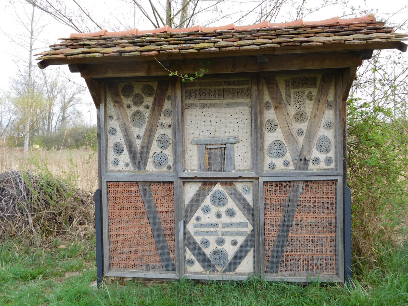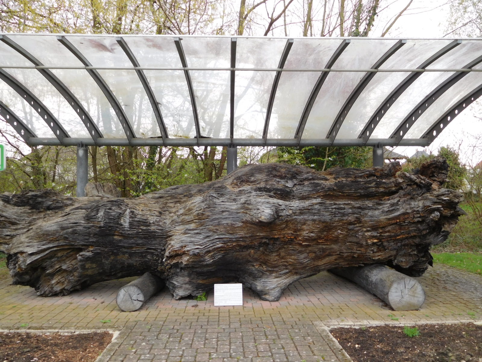 Although we were still mostly on bike paths we were really threading our way through towns and could not say we developed a rhythm of spinning along in the country side, nor of visiting a lot of super interesting urban sights. We did run in to three small points of interest from the natural world. The first was a large solitary bee house, erected by a town. We were pleased to see that the house was actually occupied and we watched several residents come and go. The second was a swan who was already sitting on a nest. I approached quietly so as not to disturb her but she was not worried. She soon tucked her head into her back and took a nap. Finally there was a giant hunk of an old tree, displayed under a shelter. The nearby sign identified this as a semi fossilized piece of an oak tree that had lived over 2000 years ago, and which had been found near the Rhine. The tree itself had attained an age of 200 years.