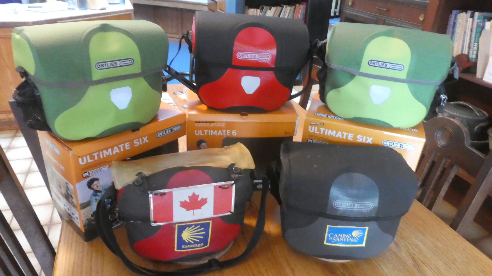 In the life of this couple (2 people) , three pieces of any type of gear does not seem to be enough! It is kind of reasonable. With bikes stashed in Germany, at home, and soon -in Mexico, six of any sort of accessory is a way to keep from dragging them back and forth. So we got Primeau to send us out a 3 pack of whatever they had on hand. We ended up with two Ultimate Six Plus 7L lime-moss green and one Ultimate Six Classic 7L in red. We understand now that the "Plus" is fabric like cordura, while the "Classic" is a more shiny vinyl type finish. Six is sixth generation, and Ultimate means nothing. Here is our bag family: