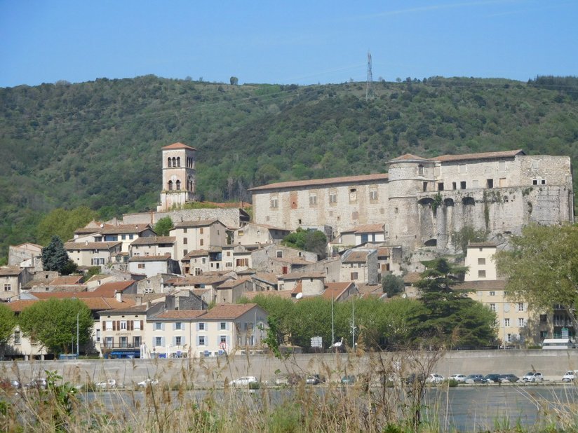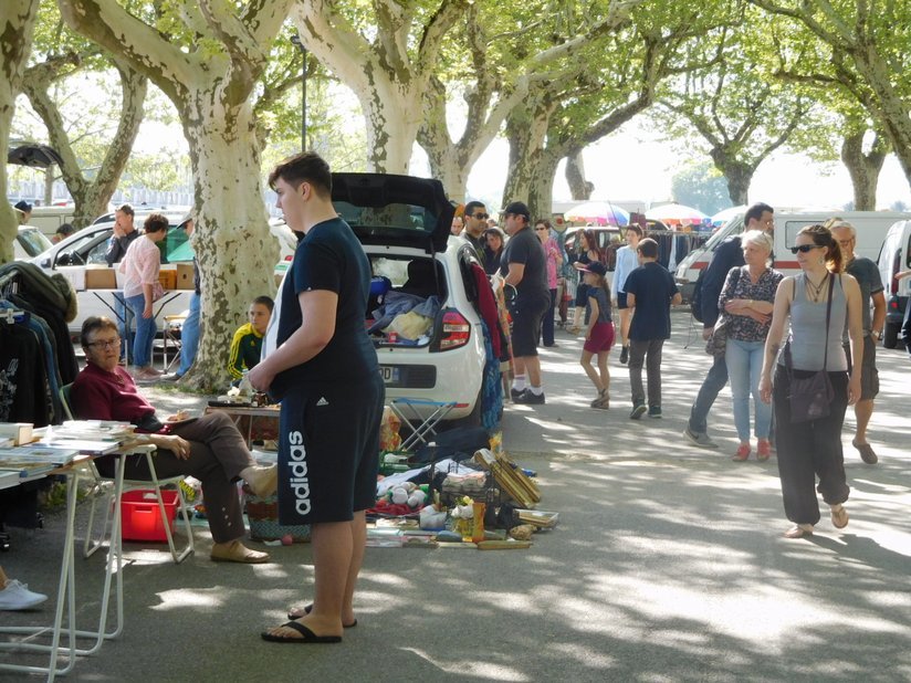 We got onto the veloroute and began pedaling along. The surface was good and it was usually by the river, but otherwise there was no excitement. After about 20 km I declared it was time for a coffee break, which means finding a bakery. So we kept our eyes open as we came to La Voulte. Actually what we really had to do was to stick to what we were trying to do. That's because as we entered town a cyclist came behind and noticing my Canadian flag quickly told about his son that is living in Quebec. Then he insisted on guiding us to the bridge out of town. But no, we wanted to be in town. After we shook the well meaning cyclist, Dodie quickly spotted a bakery. In my traditional position, parked outside with the bikes, I was free to look around. On one side was a huge Sunday flea market. The French just love these, and it's amazing how much junk they have to exchange. Straight down the street was a scene of small shops, and a roadway lined with Plane trees. It was all just so "French".