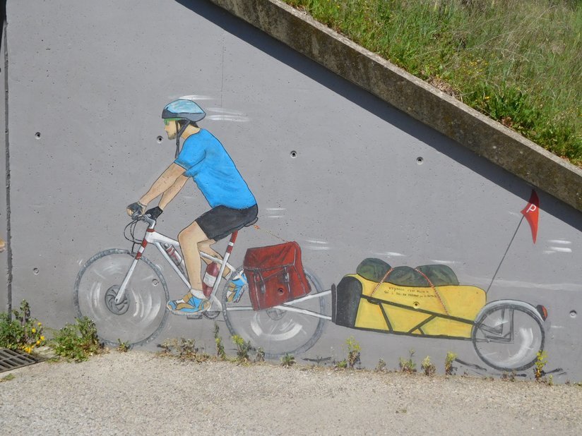 Now it was time to finally cross that bridge, but before that could happen we ran into two more touring cyclists. This was an old couple from Sweden who had started in Marseilles and were returning to Sweden. We took it upon ourselves to warn them about the 40 km of hills and no signs around Lyon. They had the Bikeline book, with the German text, and since they understood German they already had read Bikeline's recommendation to take a train around Lyon. The lady seemed ready to take this advice, but the man had a lot of faith in his orienteering skills, and and felt that with the Bikeline map and a compass they would be alright. We hope so too, but we are pretty sure it will end in tears. Unless they put a comment into this blog, we will unfortunately never know how it went. It was fun talking to them too. Sweden seems exotic to us. For example none of their equipment was of a brand that we recognized.
