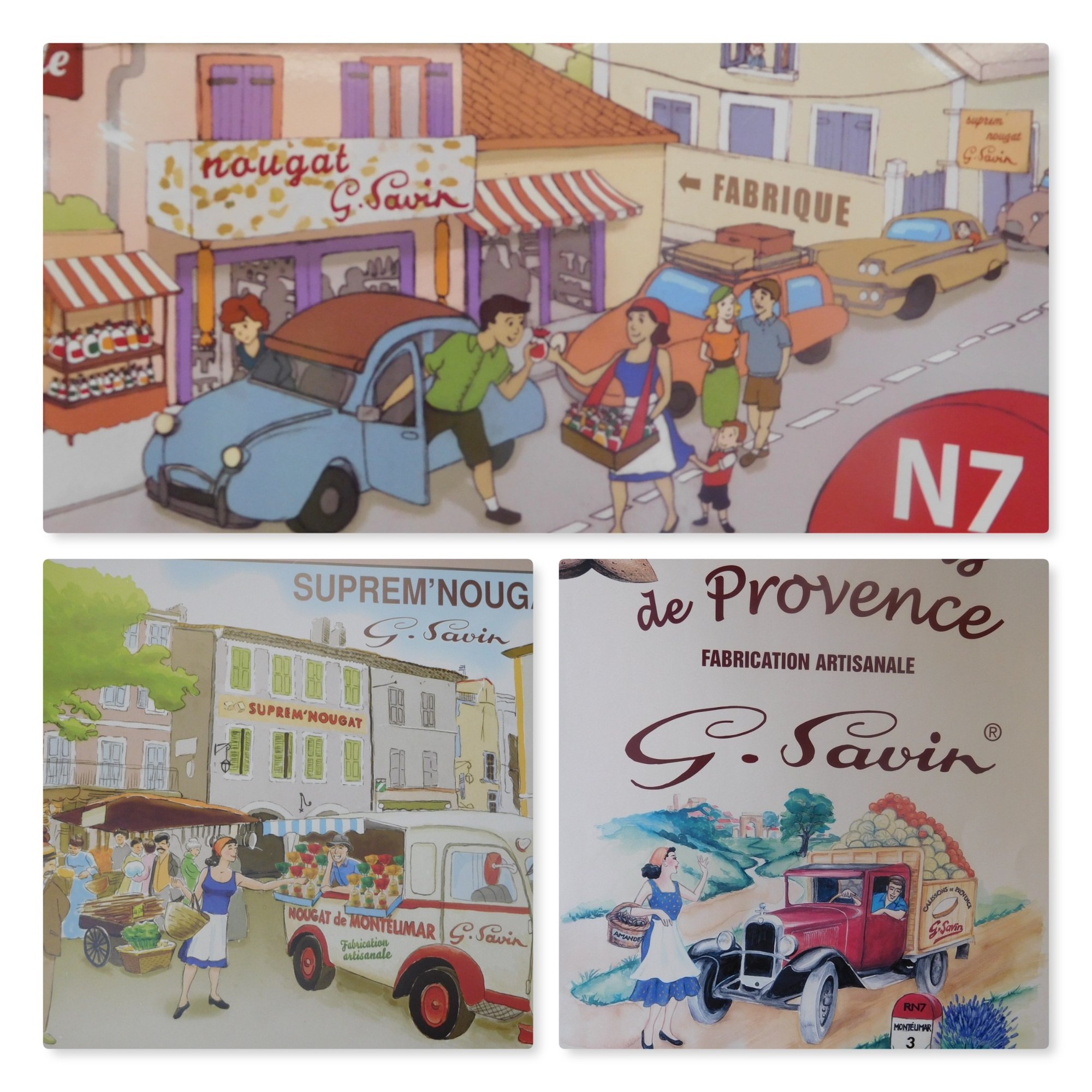 Aside from the quality of the nougat, something we like about Savin is the series of graphics they have, depicting their hayday when the National 7 passed by their door, and tourists from Paris on their way to the Med would stop in. Here is some of that art: